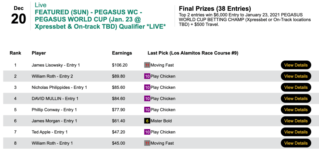 He and Willam Roth (3 wins, 1 place…including last two contest race winners at odds of 5-1 and 13-1) ran one-two to each pick up $6,500 Pegasus packages.