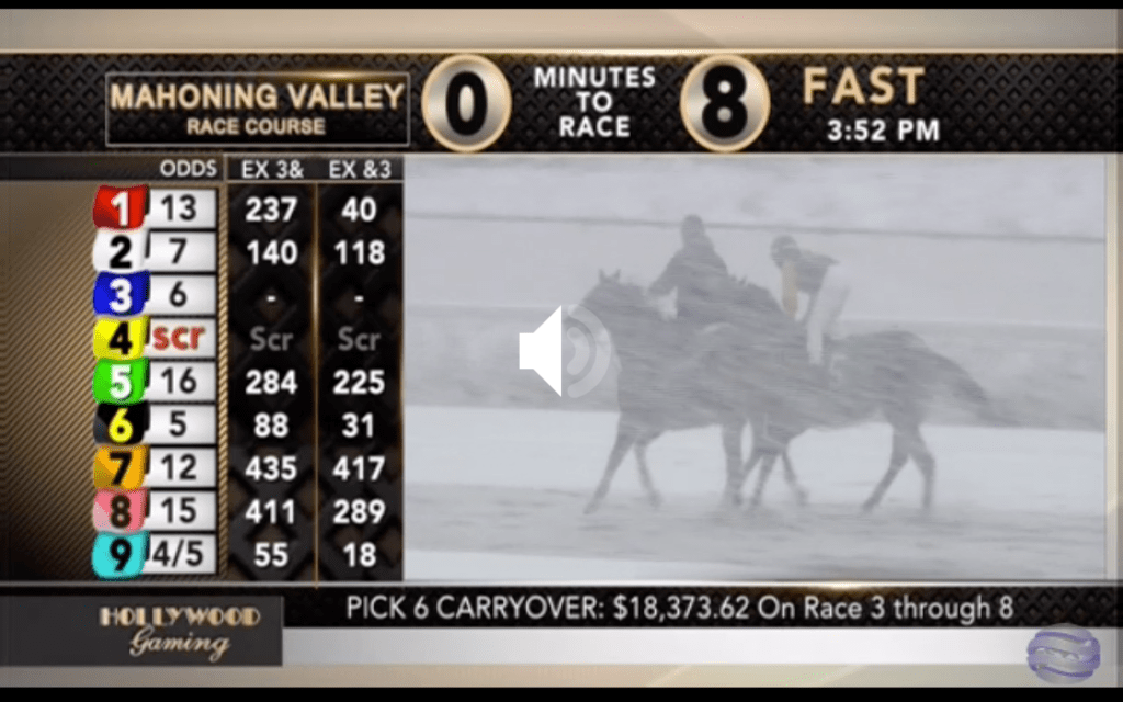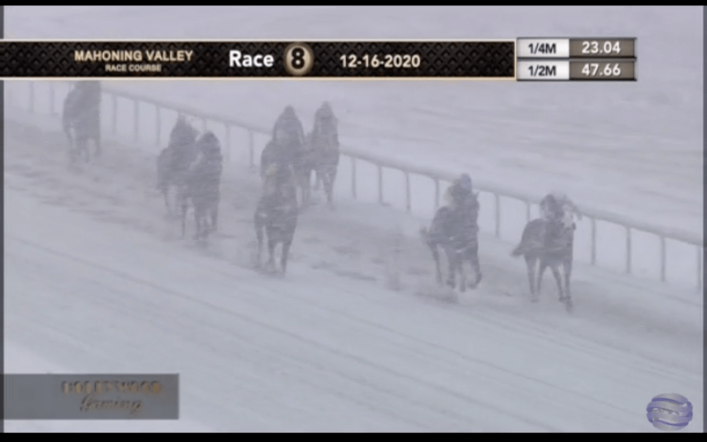 Incidentally, we don’t use Zia all that often in featured schedules, but the New Mexico track sure came in handy on Wednesday, because weather was an issue around the country that day. We passed on including Mahoning Valley in the Wednesday featured schedule. Here’s how things looked there near the end of their Wednesday card.