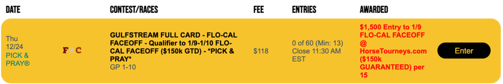 As you might guess, there will be not one, not two, but three Flo-Cal Faceoff qualifiers on Sunday—one on Gulfstream, one on Santa Anita and one of the multi-track variety. All require $118 in order to take part.