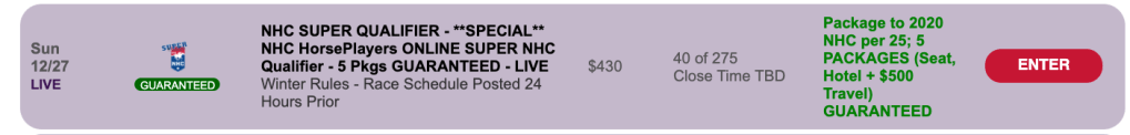 For $80, you can compete for a spot in the onsite NHC qualifier at Tampa Bay Downs on January 9th. Winners (1-per-15) get a $1,000 entry. The format is Pick & Pray.