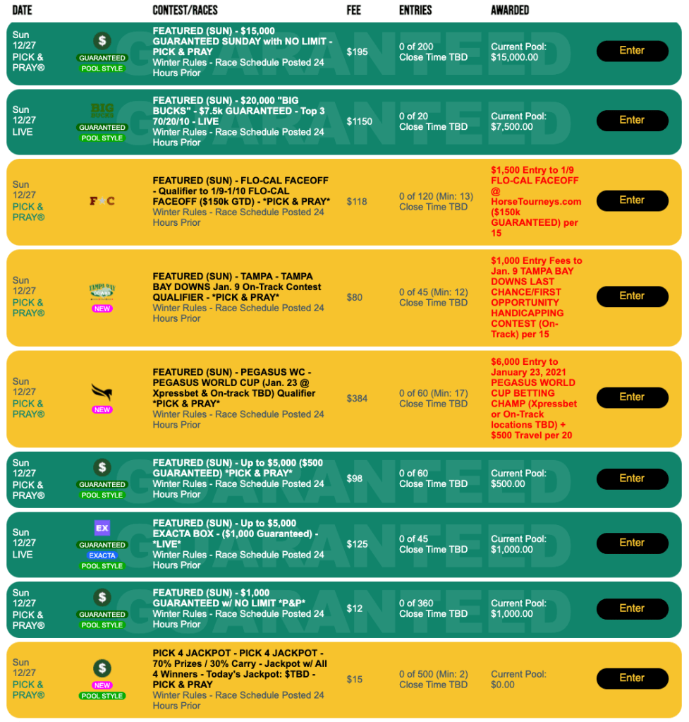 Another “always-Live” competition is Sunday’s up-to-$5,000 Exacta tourney with $1,000 Guaranteed. You pick a three-horse exacta box for each race, and whoever has the best overall (based on $1.00 payoffs with no price caps in effect) takes the top prize.