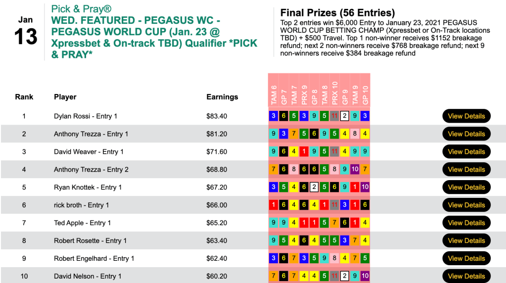 Pegasus qualifiers are in their final stages. (The last one comes this Friday.) Last Wednesday Dylan Rossi and Anthony Trezza each earned $6,500 packages to this Saturday’s big event with scorecards that were mirror images of each other. Rossi had 5 wins and 2 places. His winners paid no more than $10.80. Trezza recorded 2 wins and 5 places. Those place collections were plenty solid for Trezza, though. They returned place mutuels ranging from $4.00 to $15.00. There’s almost always more than one way to skin a cat here.