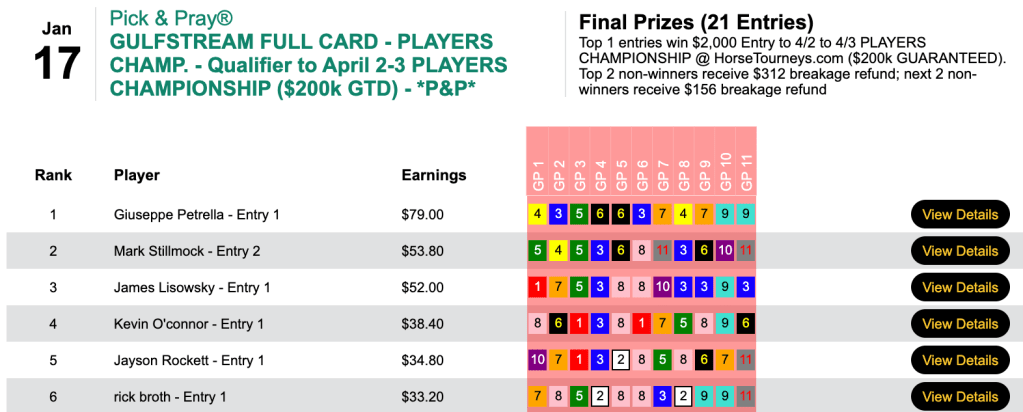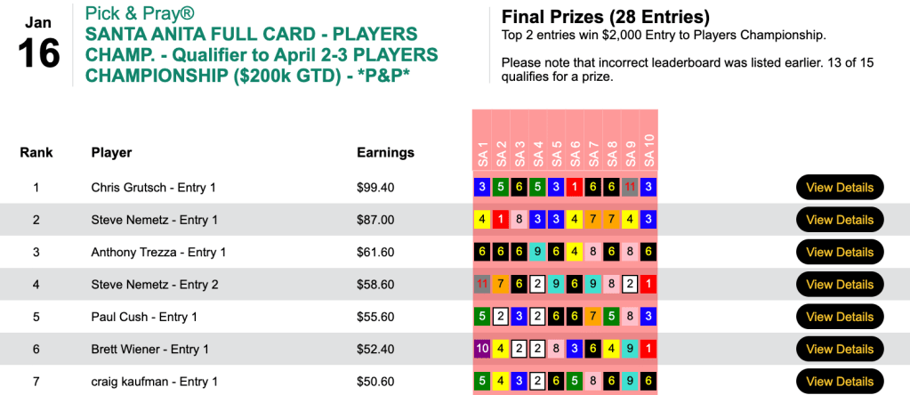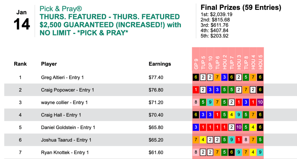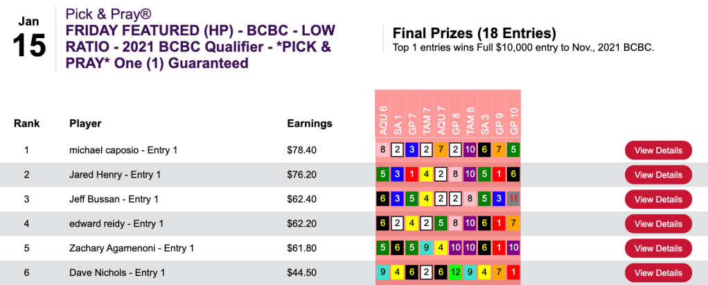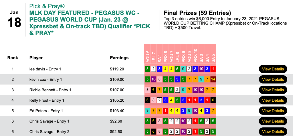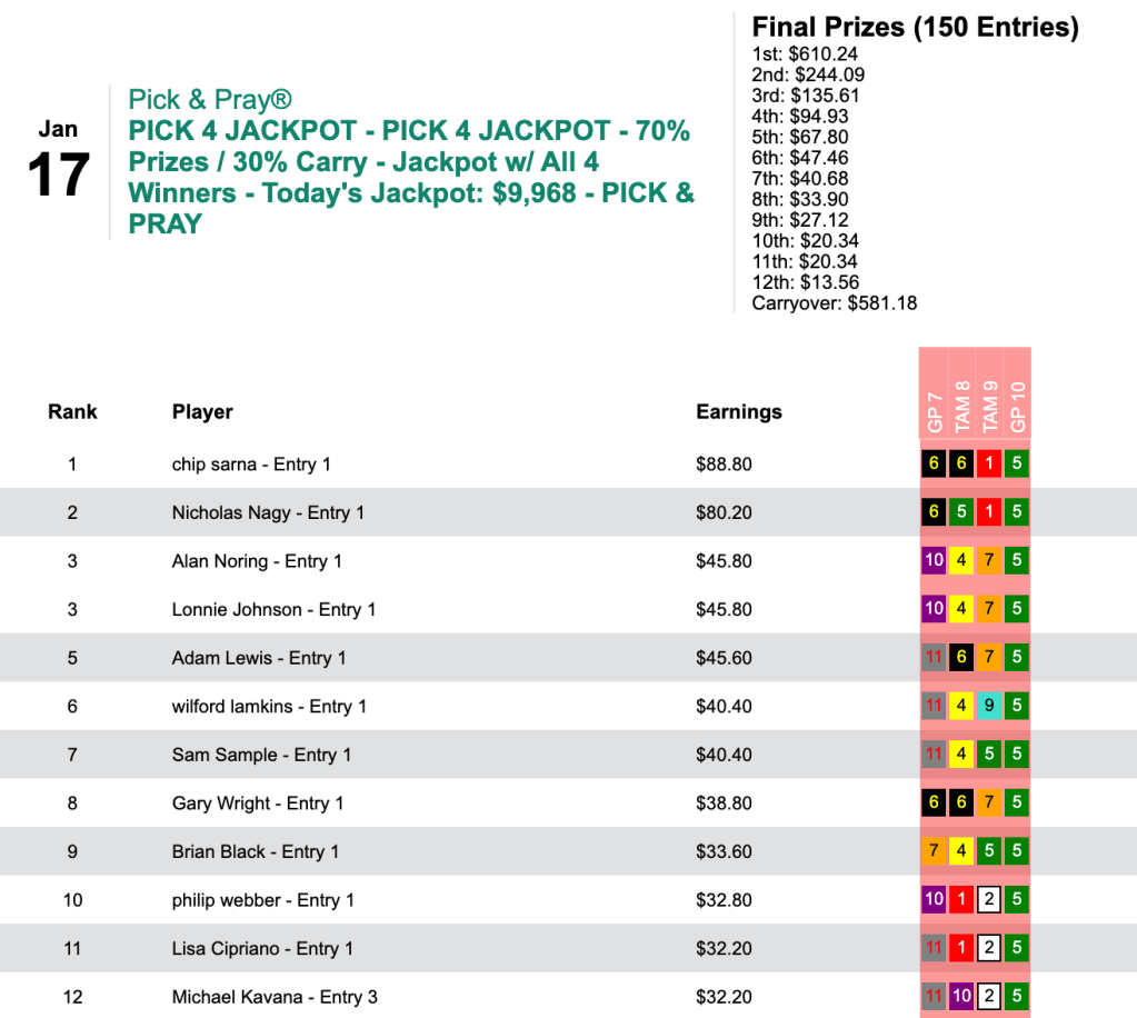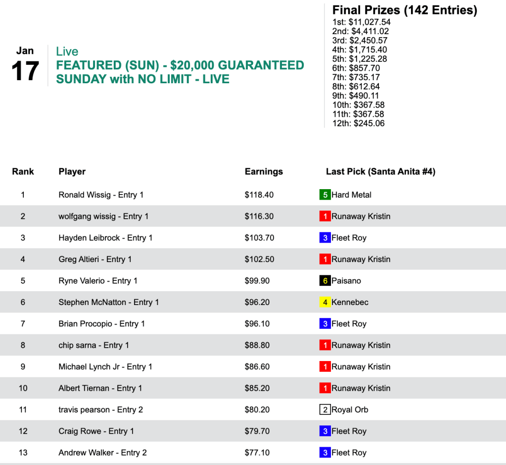 This Pick & Pray tourney had a bit of a crazy finish. The only one of the top three to cash anything in the last race was Cox, who collected a vital $4.60 place payoff that moved him from 4th to second.
