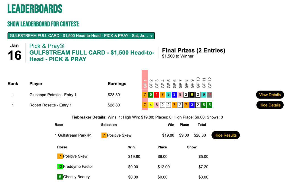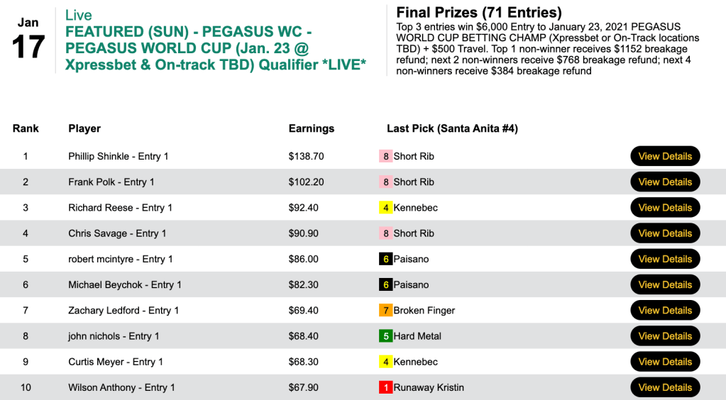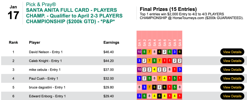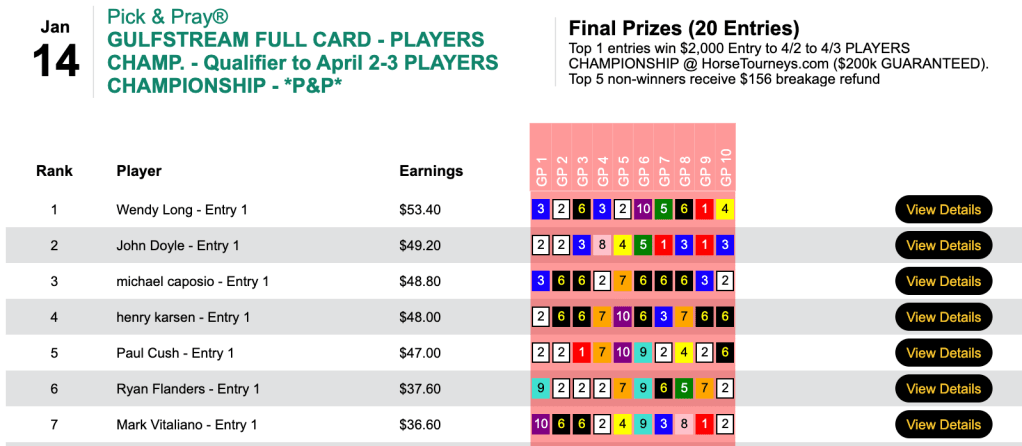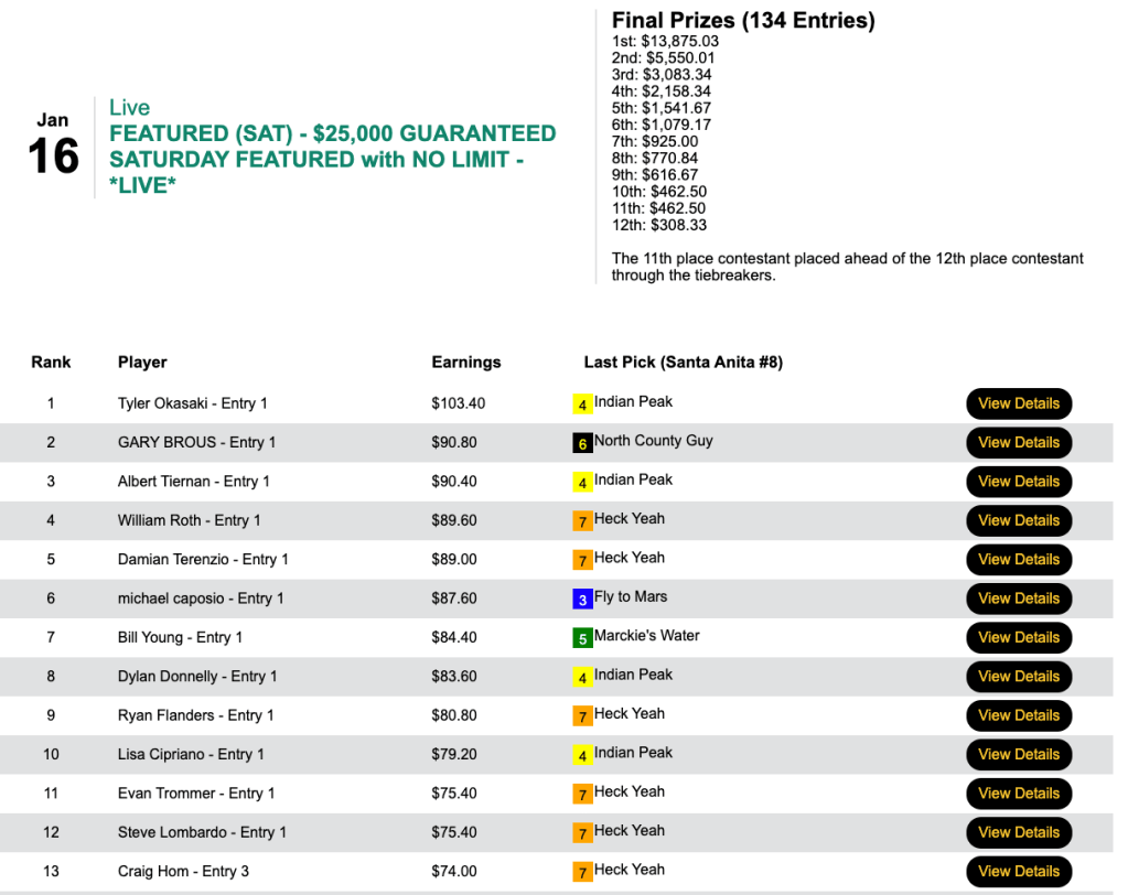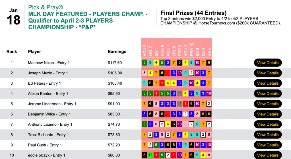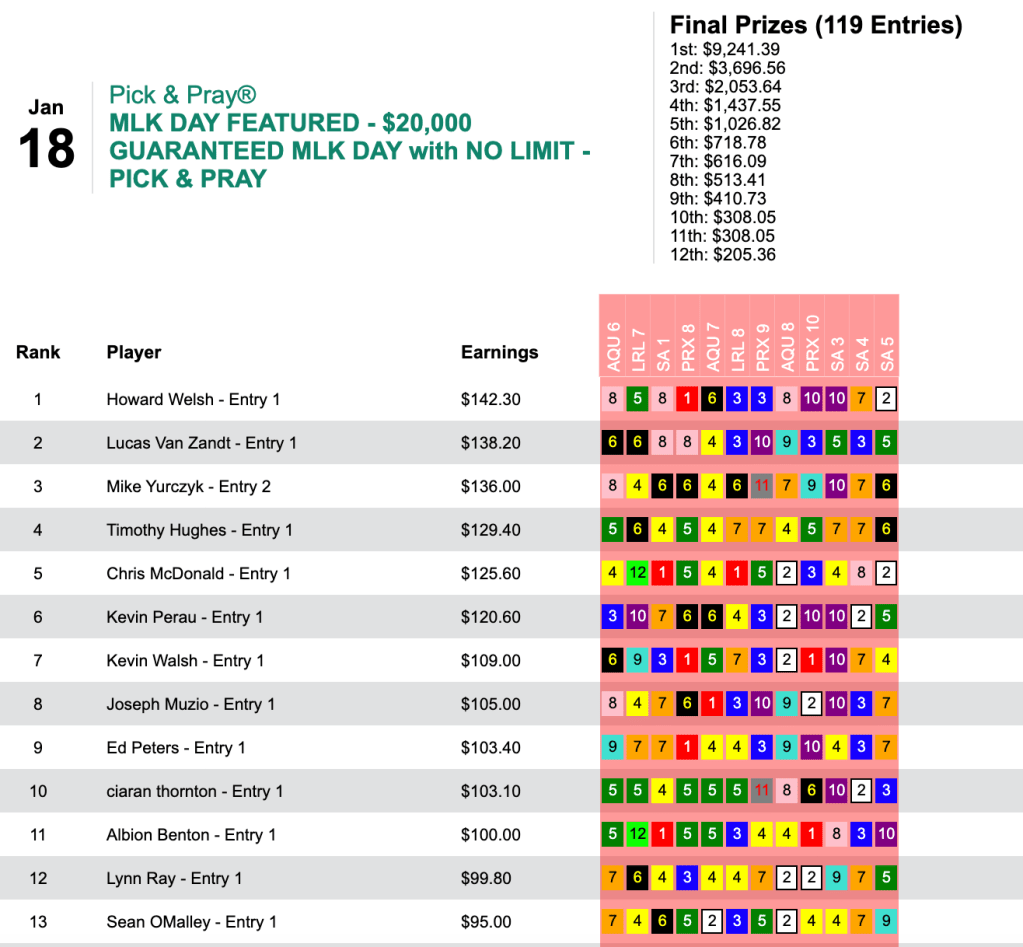 This Pick & Pray tourney had a bit of a crazy finish. The only one of the top three to cash anything in the last race was Cox, who collected a vital $4.60 place payoff that moved him from 4th to second.