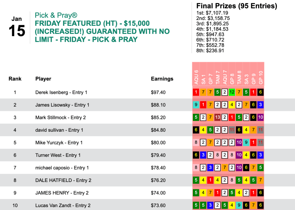 Remember how Michael Caposio shifted abruptly from the breakdown lane to the passing lane? Well Derek Isenberg drove like a speed-happy teenager during the first half of Friday’s $15,000 Guaranteed Pick & Pray. He recorded all five of his collections (4 wins, 1 place) in the first five races. Then, as if spotting a state trooper hiding in the bushes, he moved over to the right lane and drove like an old man, getting not a single additional collection. Isenberg still reached his destination successfully, though, and he was rewarded with $7,107 for doing so.