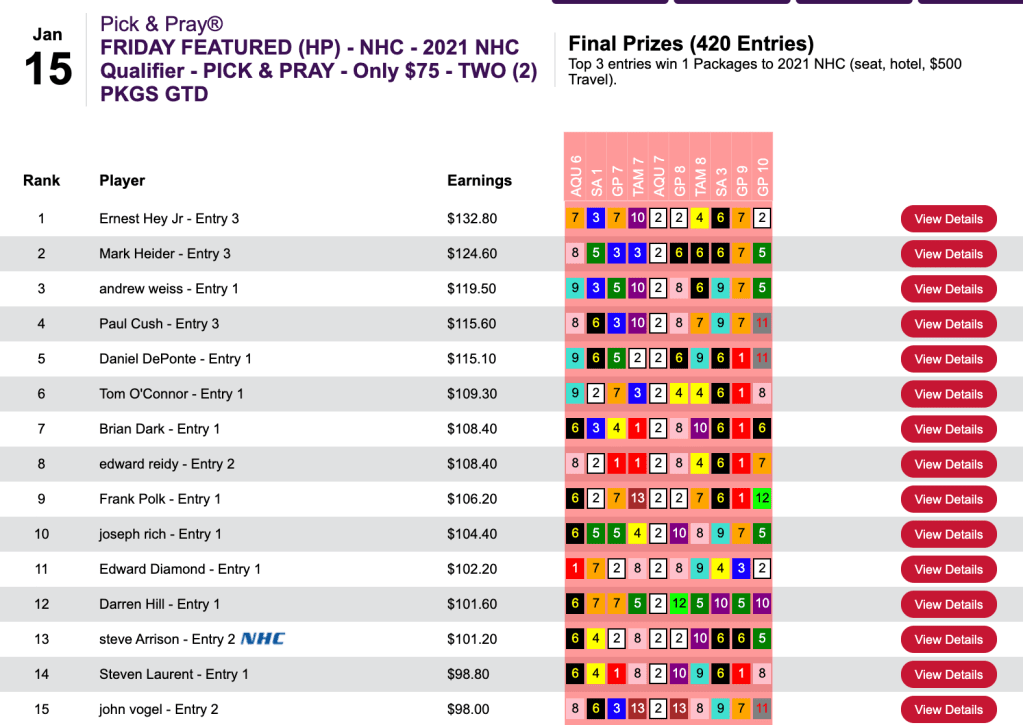 There seemed to be a real uptick in participation in NHC qualifiers last week. Friday’s $75, 2-spots-gtd. play-in at HorsePlayers attracted enough entries to award a third seat.