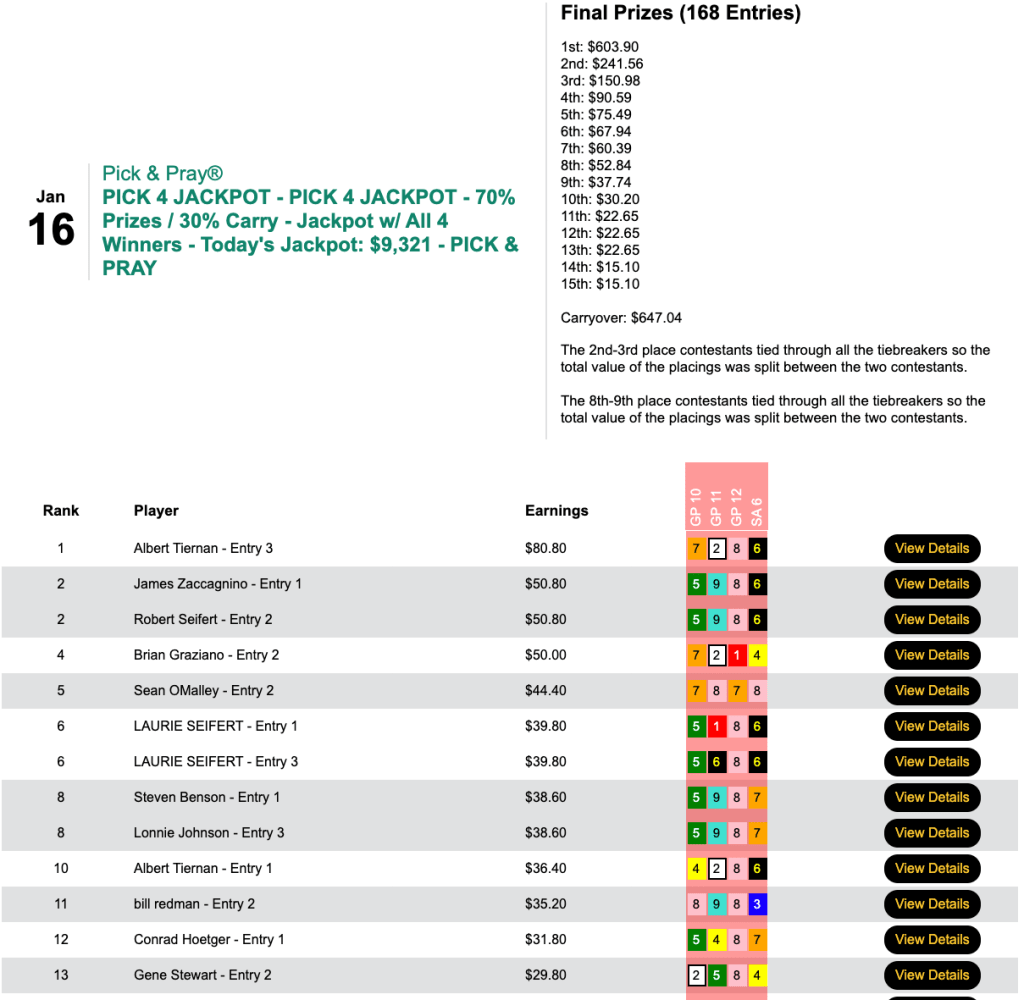 Just like on Saturday, there was no perfect, 4-for-4 ticket. Chip Sarna claimed the top spot thanks to having the final two winners in the sequence. The lack of perfection means that next Saturday’s Pick 4 Jackpot tourney will begin with a now-five-figure carryover of $10,549.