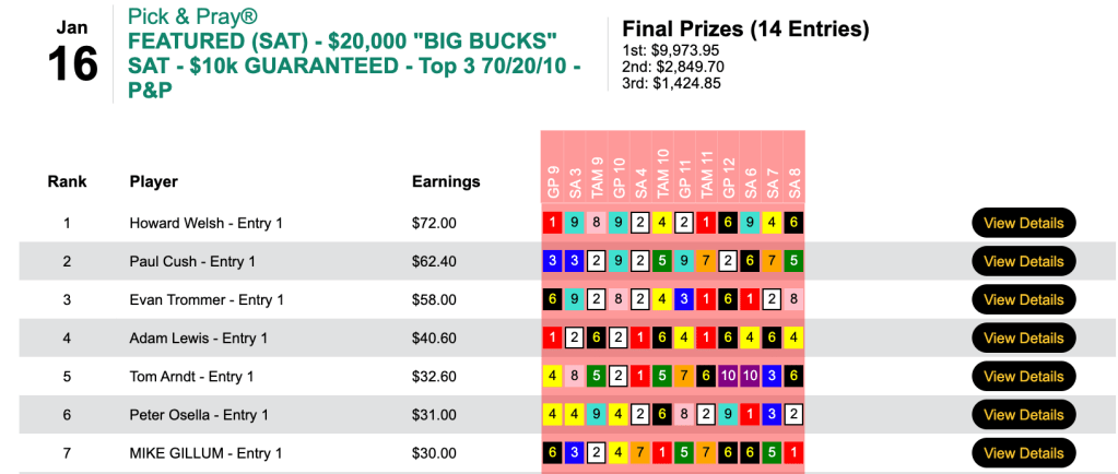 There’s one more Saturday feature to report—the $10,000 Guaranteed Big Bucks Pick & Pray.