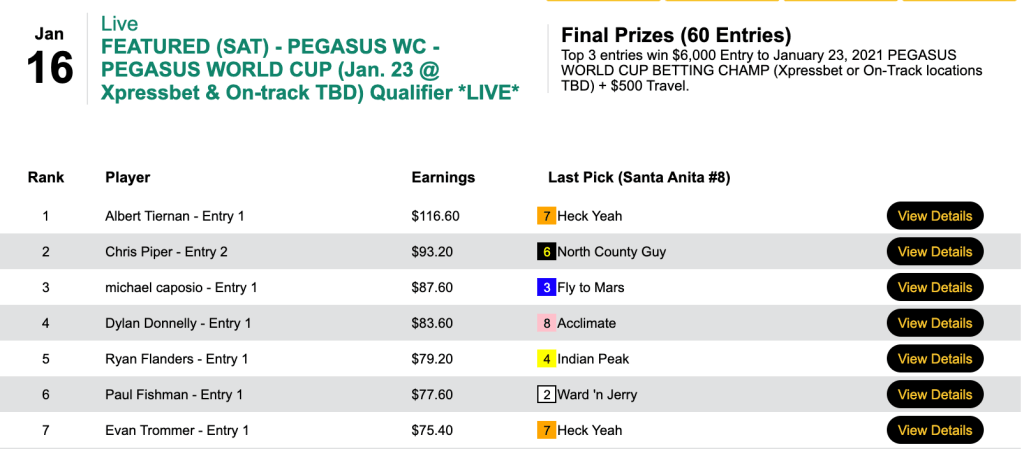 Back to Saturday, where—last we checked—Albert Tiernan was ruling the Pegasus qualifier.