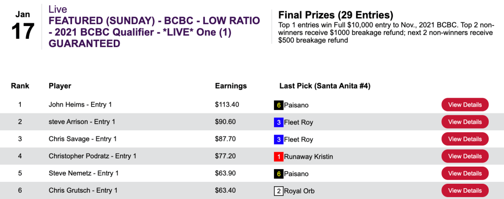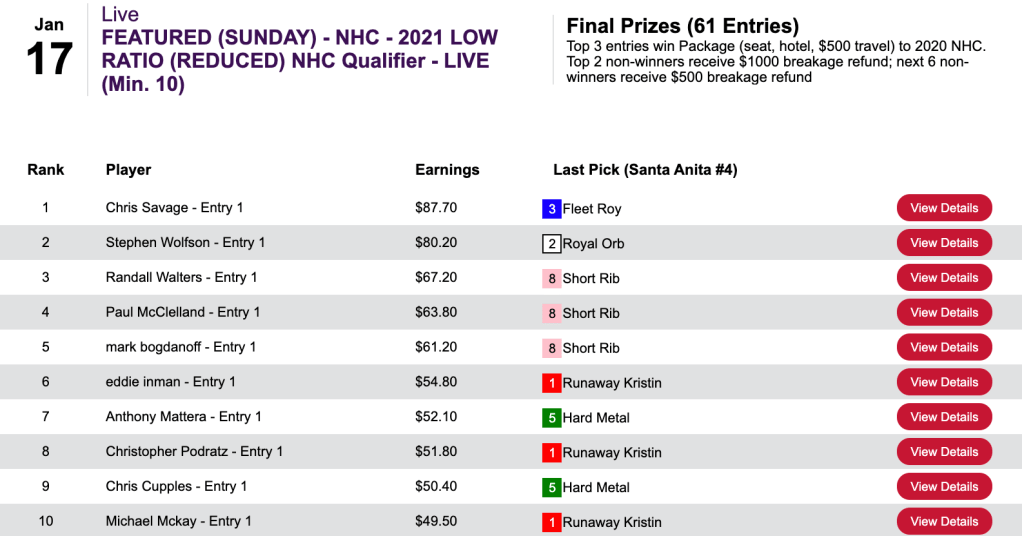 Sunday’s NHC qualifier at HorsePlayers was also a Low Ratio affair.