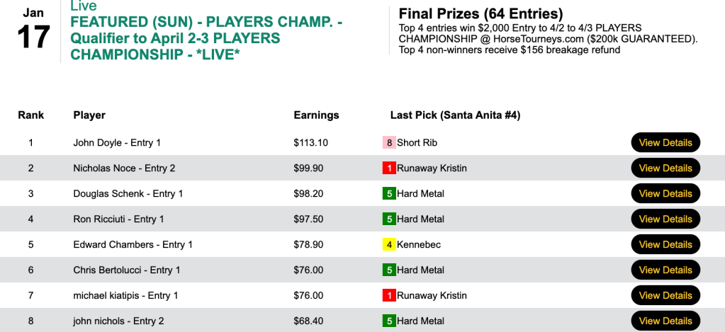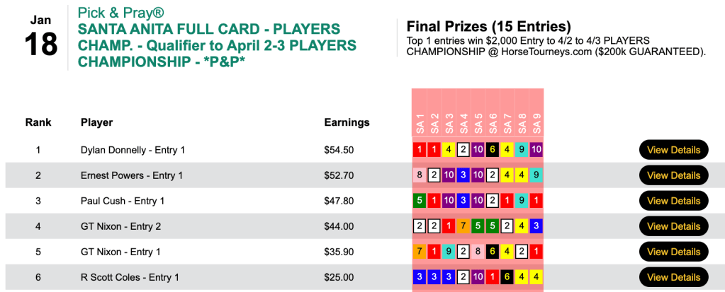 The lone Players Championship qualifier on Saturday was a Santa Anita-only, full-card play in.