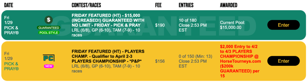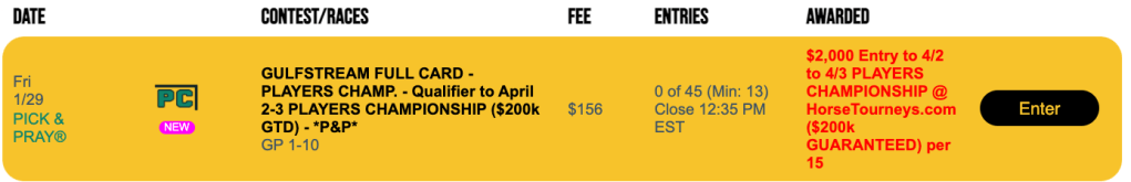 We’ll also again have a pair of single-track, 1-per-15 Players Championship qualifiers for $156 each. One will be on Gulfstream and the other on Santa Anita.