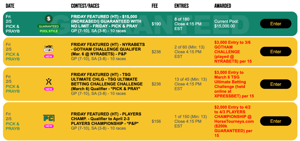 It’s a Pick & Pray weekend this week at HorseTourneys, and all of our Saturday features will be of the “Set it and forget it” variety.