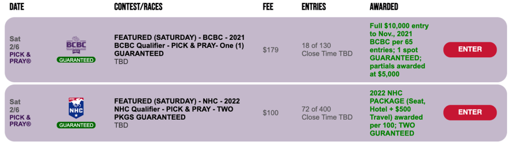 The other is a special $100 Pick & Pray qualifier to the 2022 NHC with two seats guaranteed. The winning ratio in this one is 1 in 100 (similar to Super Bowl squares).
