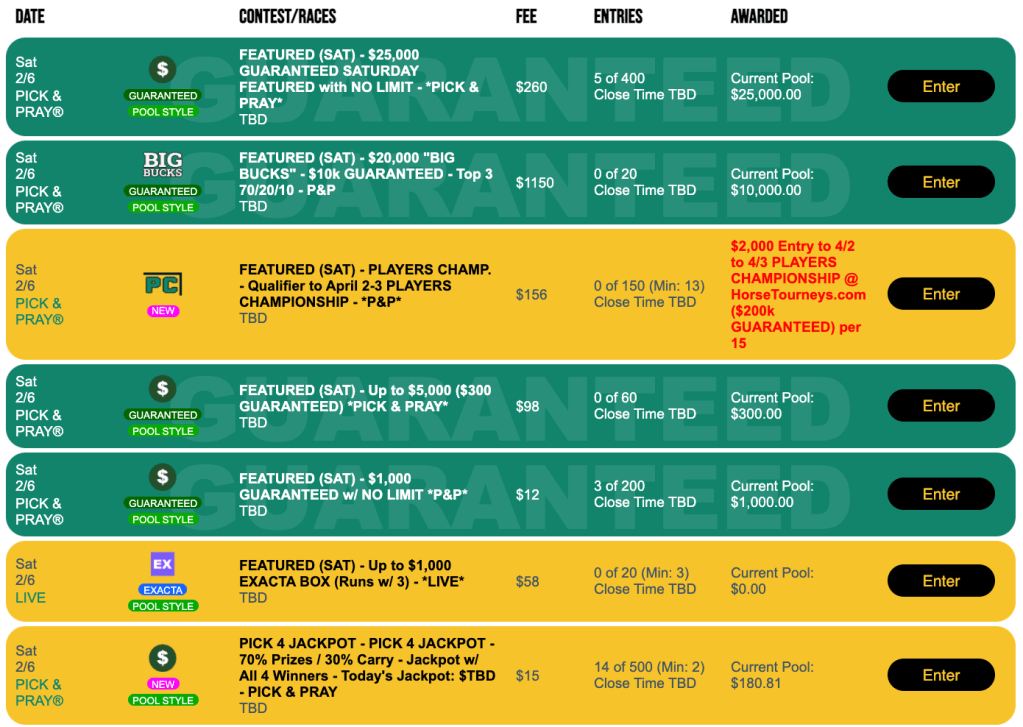 Not held on March 6th is the Players Championship. One of every 15 in our multitrack “PC” qualifier will have parlayed a $156 entry fee into a $2,000 seat at our table for the $200,000 Guaranteed event here on April 2-3. In addition to a Sunday multitrack Pick & Pray, we’ll likely have a Gulfstream single-track play-in (also $156) for the Players Championship as well. Check the home page schedule for up-to-the-minute developments/offerings.