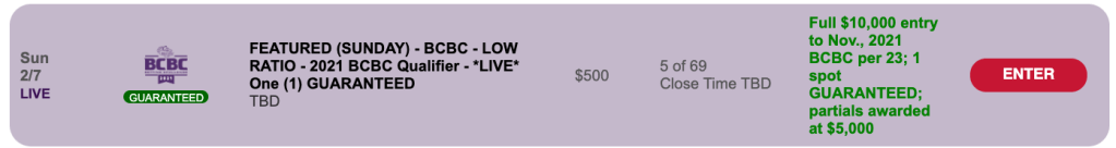 It’s a live-format, low-ratio qualifier guaranteeing at least one $10,000 BCBC entry. The winning ratio is 1-per-23 in this $500 tourney.