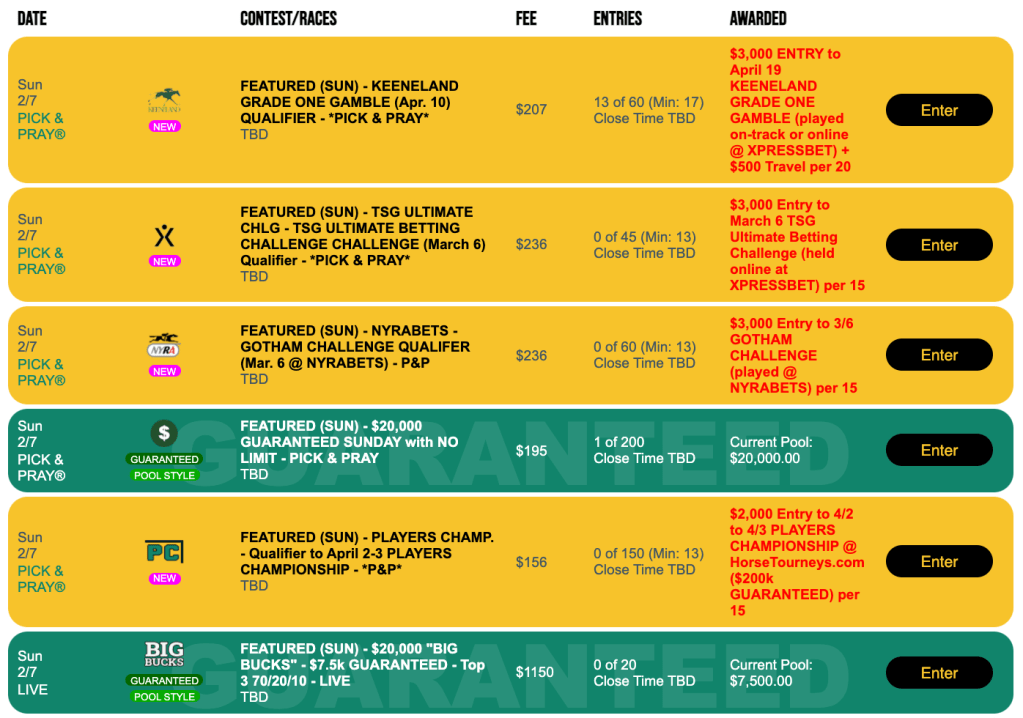 No picking and praying here. The Sunday Big Bucks tourney will be run as a 12-race, all-mandatory, live-format game. It has a guarantee of $7,500, and the final pot could reach $20,000 if we reach the maximum 20 entrants. The entry fee is $1,150, and prizes go just to the first three.
