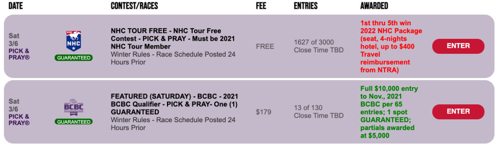 It’s the first of the year’s free NHC qualifiers—available to all those with a paid-up 2021 NHC Tour membership. If you’re not a member, you can become one quickly and easily at NTRA.com. NHC berths for January 2022 go to the top five finishers and potentially valuable NHC Tour points go to the top 100 scorers. Note that this will be a special 15-race Pick & Pray, and those 15 races will be: