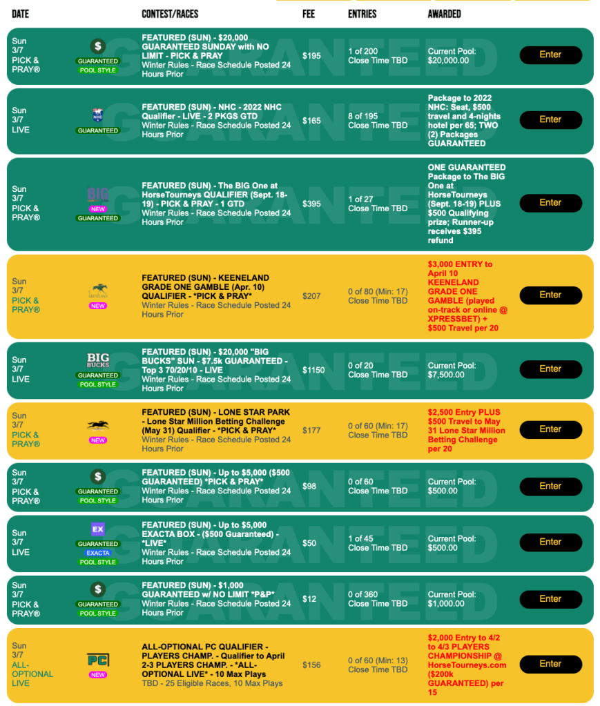 We’re back to Pick & Pray for the rest of the Sunday HorseTourneys featured slate—including our $20,000 Guaranteed No Limit event. The entry fee is $195.