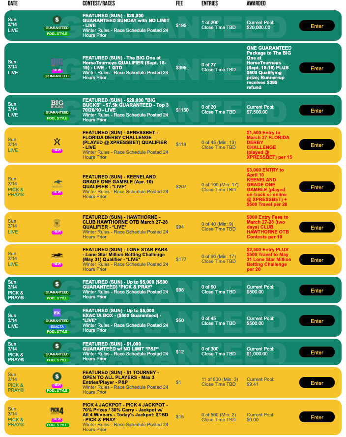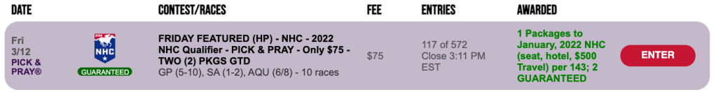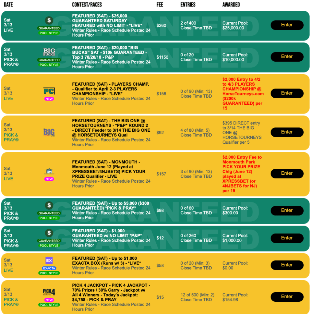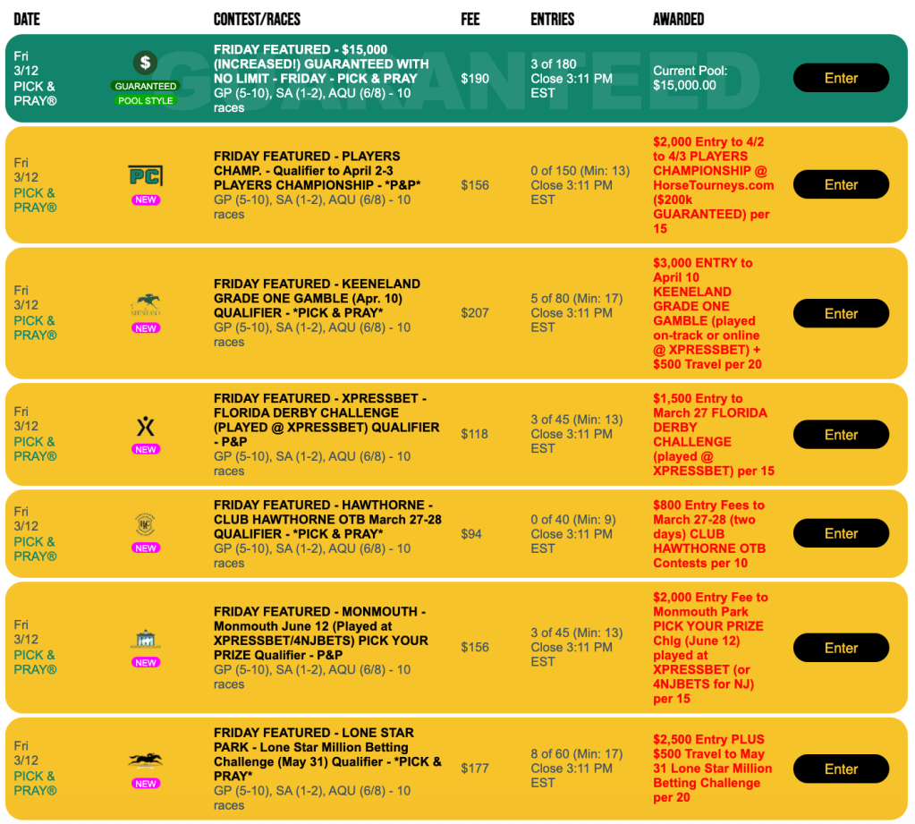 Two new tourneys join the lineup of qualifiers on Friday. One is to the Florida Derby Challenge at Xpressbet. On March 27th (Florida Derby Day), an entry will set you back $1,500. You can acquire one for $118, however, in Friday’s Pick & Pray, which has a winning ratio of 1 per 15.