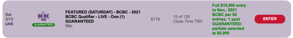 Saturday’s Monmouth Pick Your Prize qualifier also costs $156 to play and also offers a $2,000 seat as a top prize. On June 12th, Pick Your Prize contestants compete for NHC seats, BCBC entries and cash for successfully playing the day’s Monmouth card.