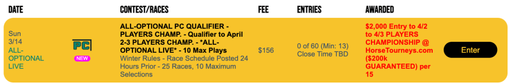 One of them is actually an All Optional Live game—Sunday’s Players Championship qualifier. We do this so that some of you can get more accustomed to the format in which the Players Championship, itself, will take place. This Sunday, you make 10 plays from among 25 races. However, the entry fee ($156) and the winning ratio (1 per 15) remain the same as in our Friday and Saturday Players Championship qualifiers.