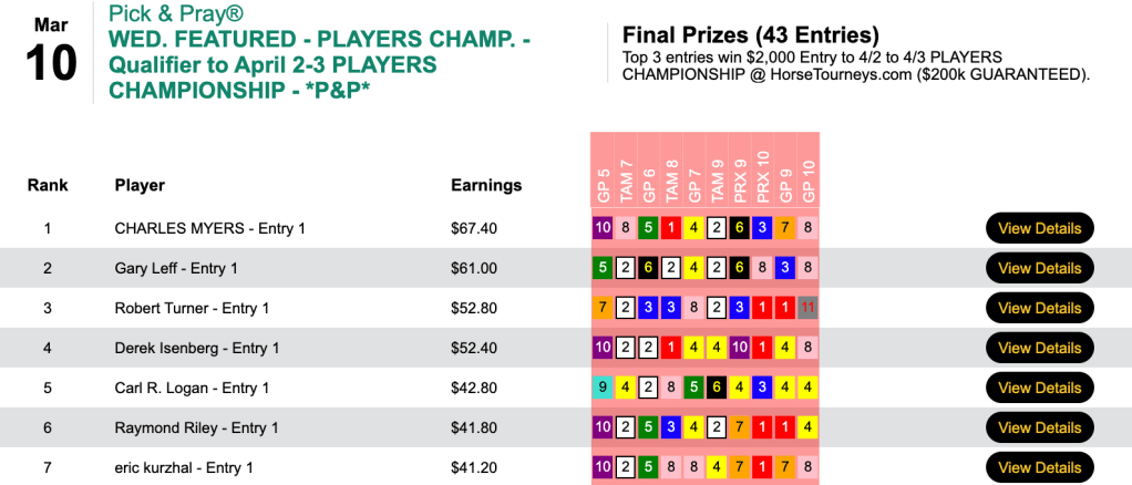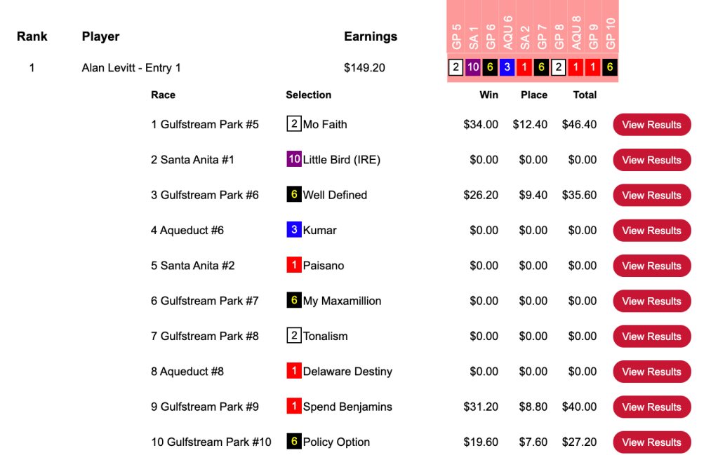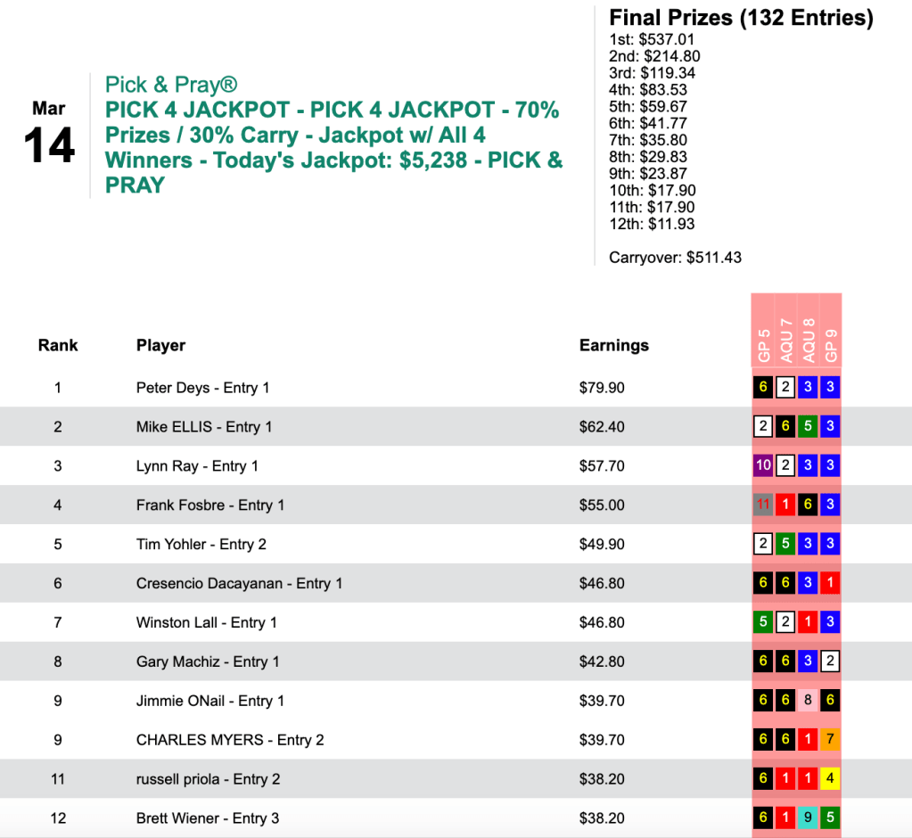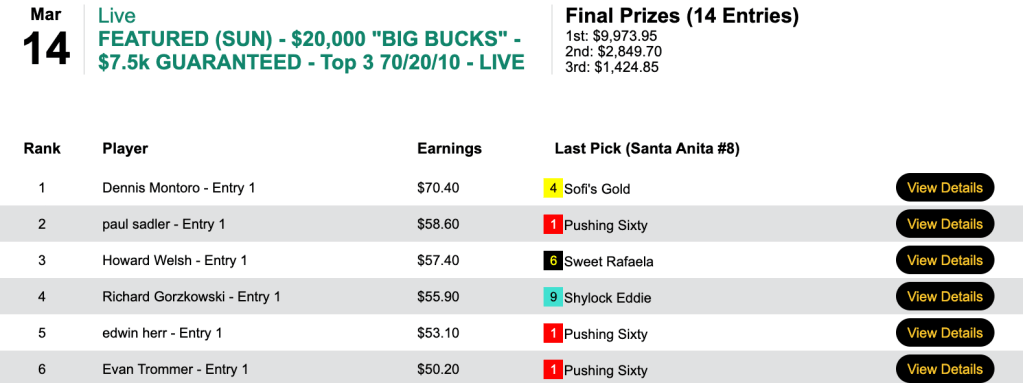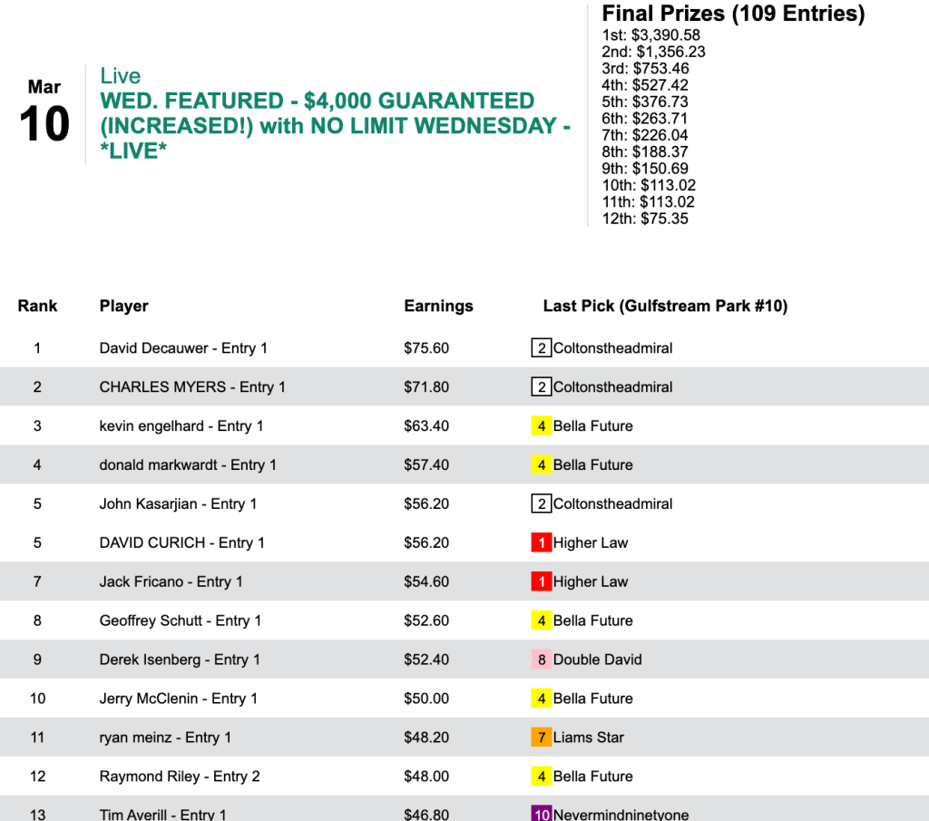 For the best-of-day performance, eye doctor Trezza saw $8,079 enter his HorseTourneys account. The final purse for the high-scoring game was $17,955—$3,231 of which went to runner up (for a change) Levitt.