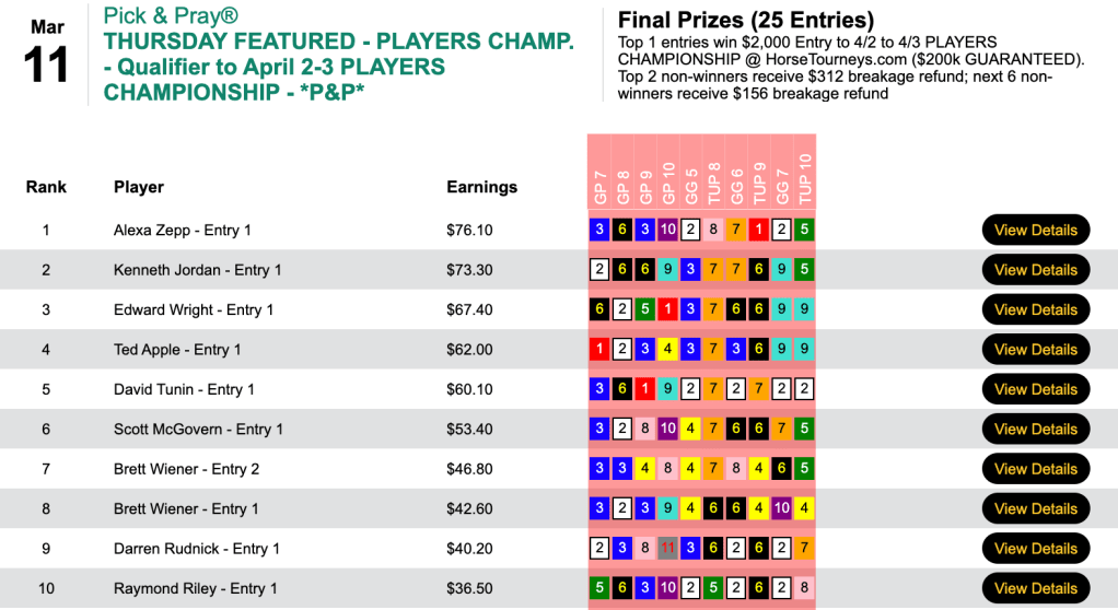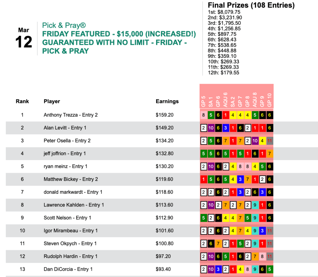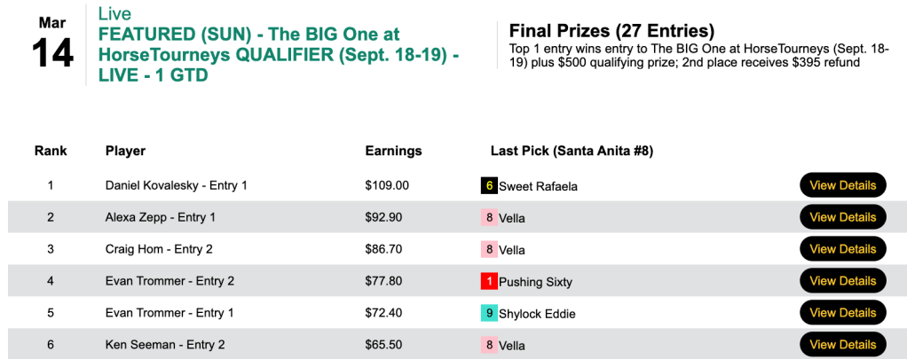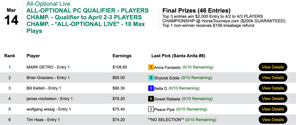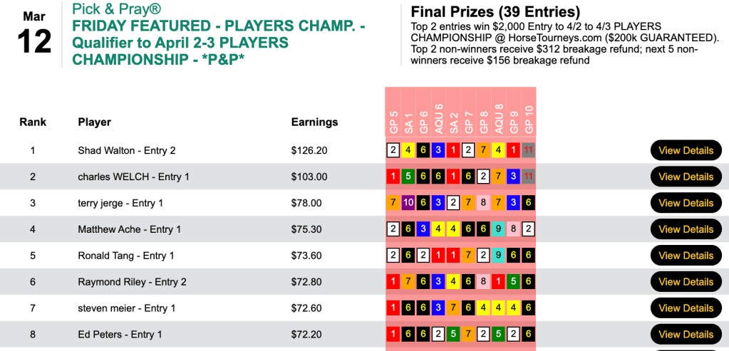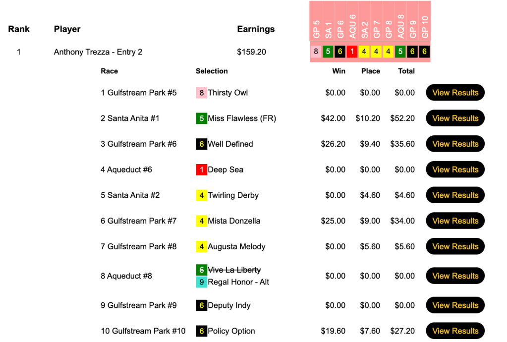 For the best-of-day performance, eye doctor Trezza saw $8,079 enter his HorseTourneys account. The final purse for the high-scoring game was $17,955—$3,231 of which went to runner up (for a change) Levitt.