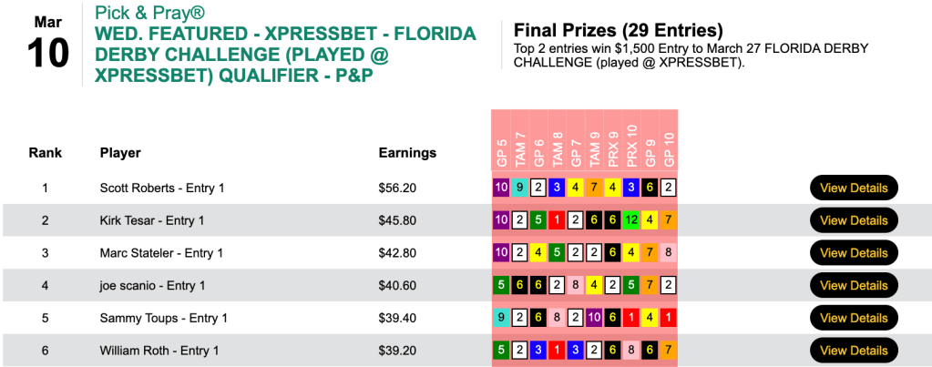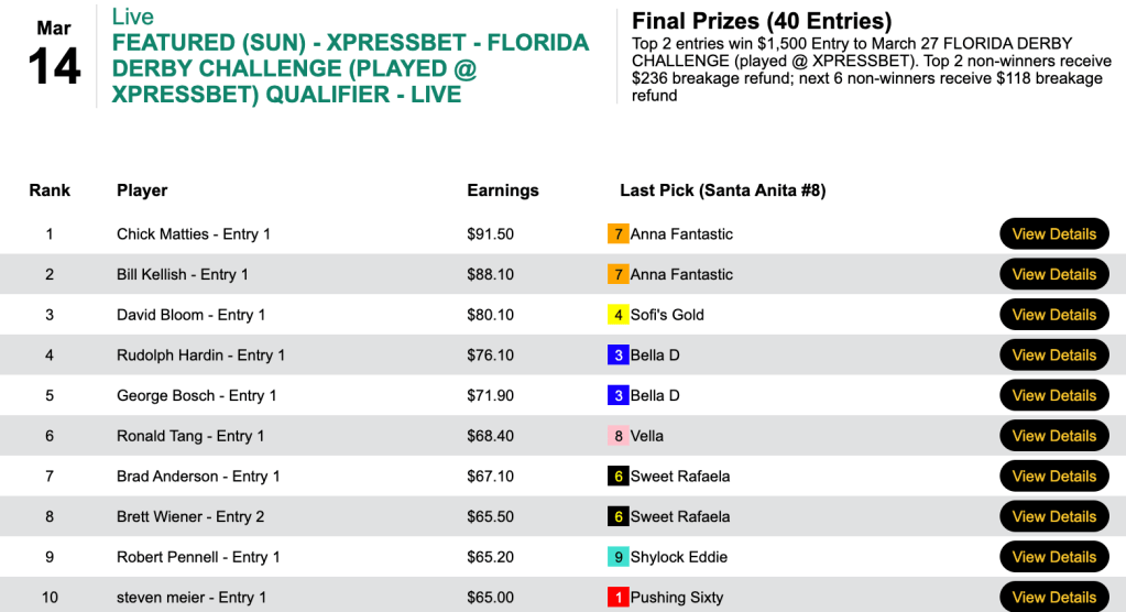 Chick Matties (who knows a good handicapper when he sees one…or sires one) and Bill Kellish took the top spots in Sunday’s Florida Derby Challenge play-in. Matties ended up with 5 wins and 3 places, including the final two race winners at odds of 9-1 and 3-2. Kellish recorded 3 wins and 3 places.