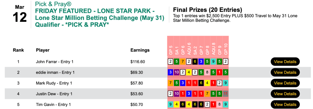 John Farrar was a wire-to-wire winner of Friday’s Lone Star Million Betting Challenge qualifier.