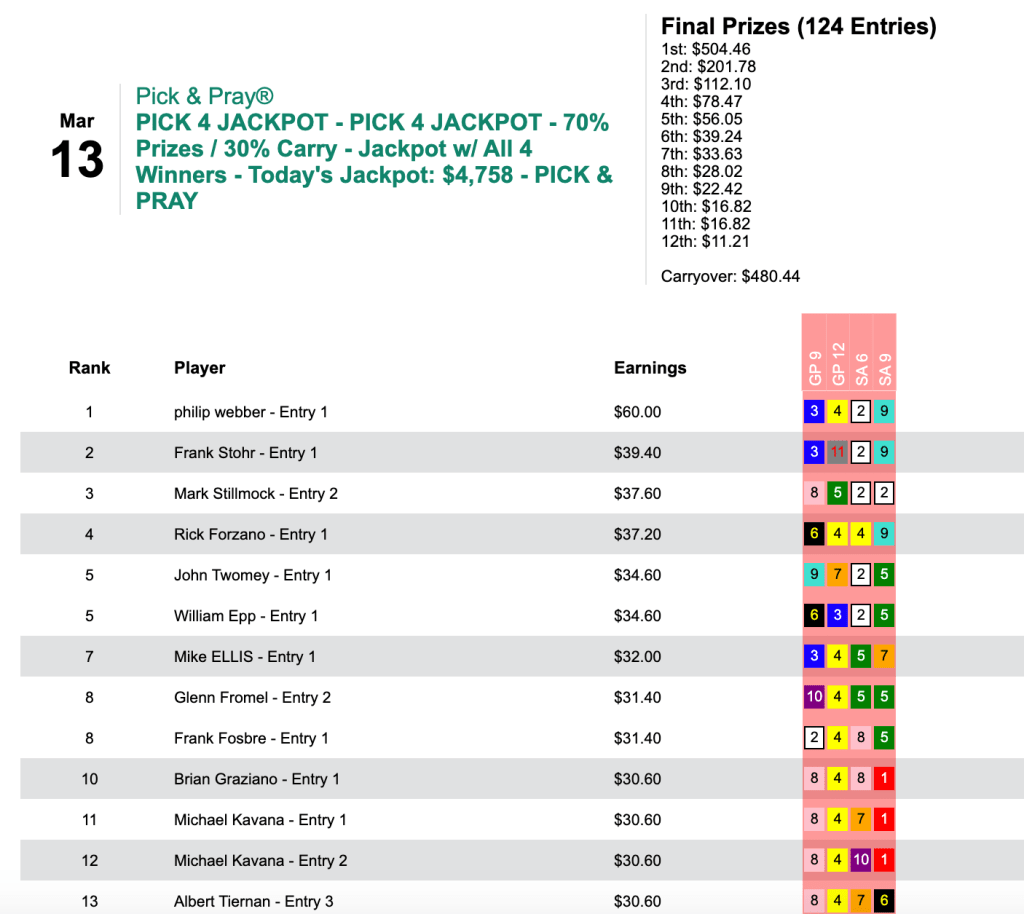 Philip Webber landed in the top spot with 2 wins and 2 places in Saturday’s $15 Pick 4 Jackpot tourney.