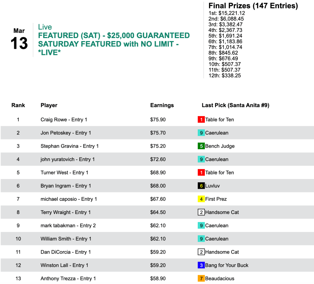 Donald Markwardt (2 wins, 3 places) took home the top money of $10,406 in large part due to the exploits of Hot Box ($58.40, $12.20) in the 4th at Santa Anita. The final pot for the game came to a total of $23,125. Daniel Kovalesky finished 2nd to pick up $4,162 in addition to his Sunday Keeneland and The BIG One seats.