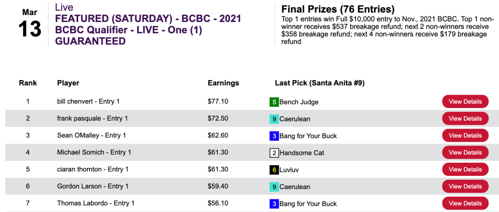 Over at HorsePlayers, Bill “BC” Chenvert captured the day’s featured tourney, a $179 Breeders’ Cup Betting Challenge qualifier.