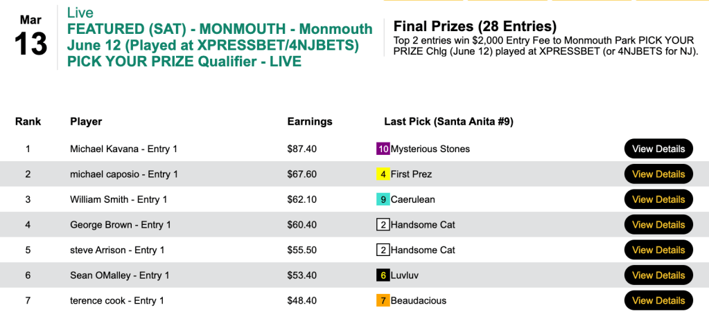 Michael “Copa” Kavana didn’t have that $15.80 “bomb” (Tobacco Road in the 6th at Santa Anita), but he came up with 6 other winners—including a couple of 6-1 shots—to finish with the day’s high score and win Saturday’s Monmouth Pick Your Prize qualifier.