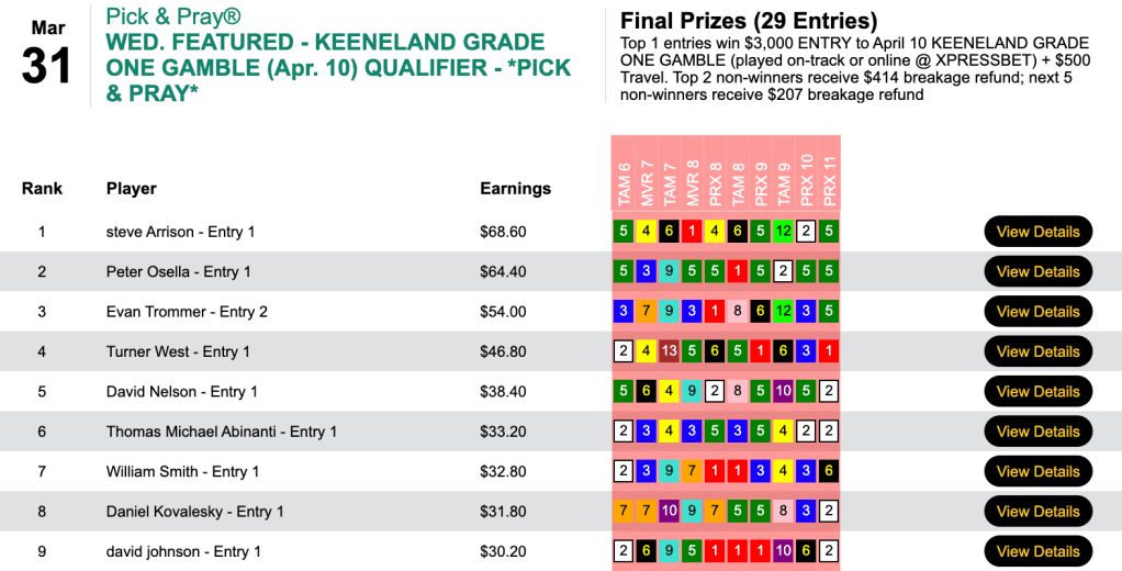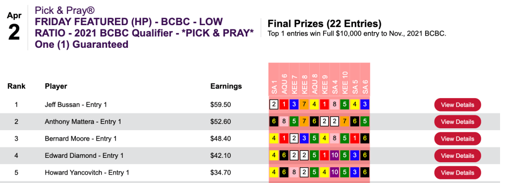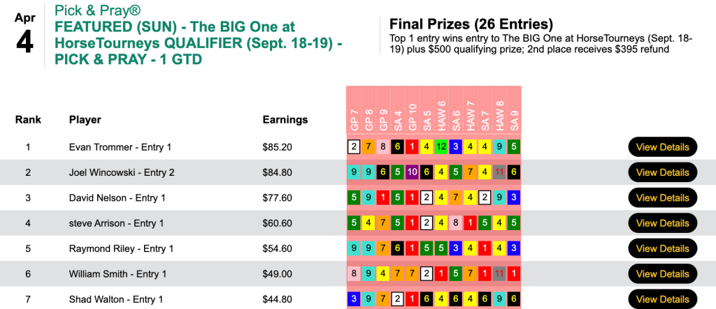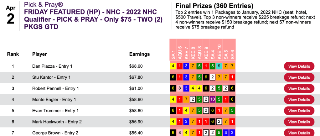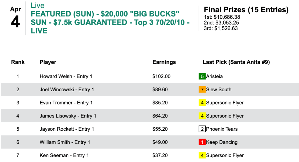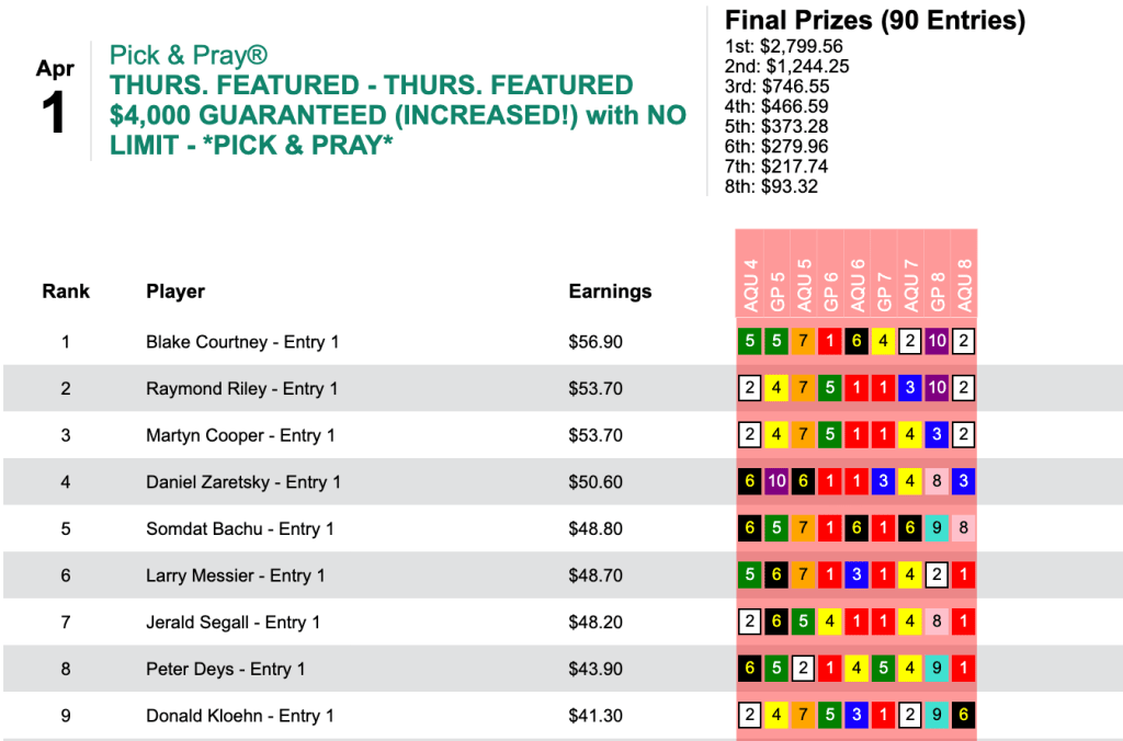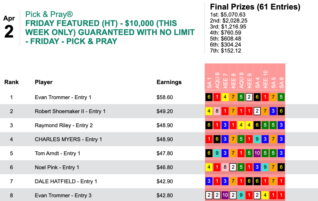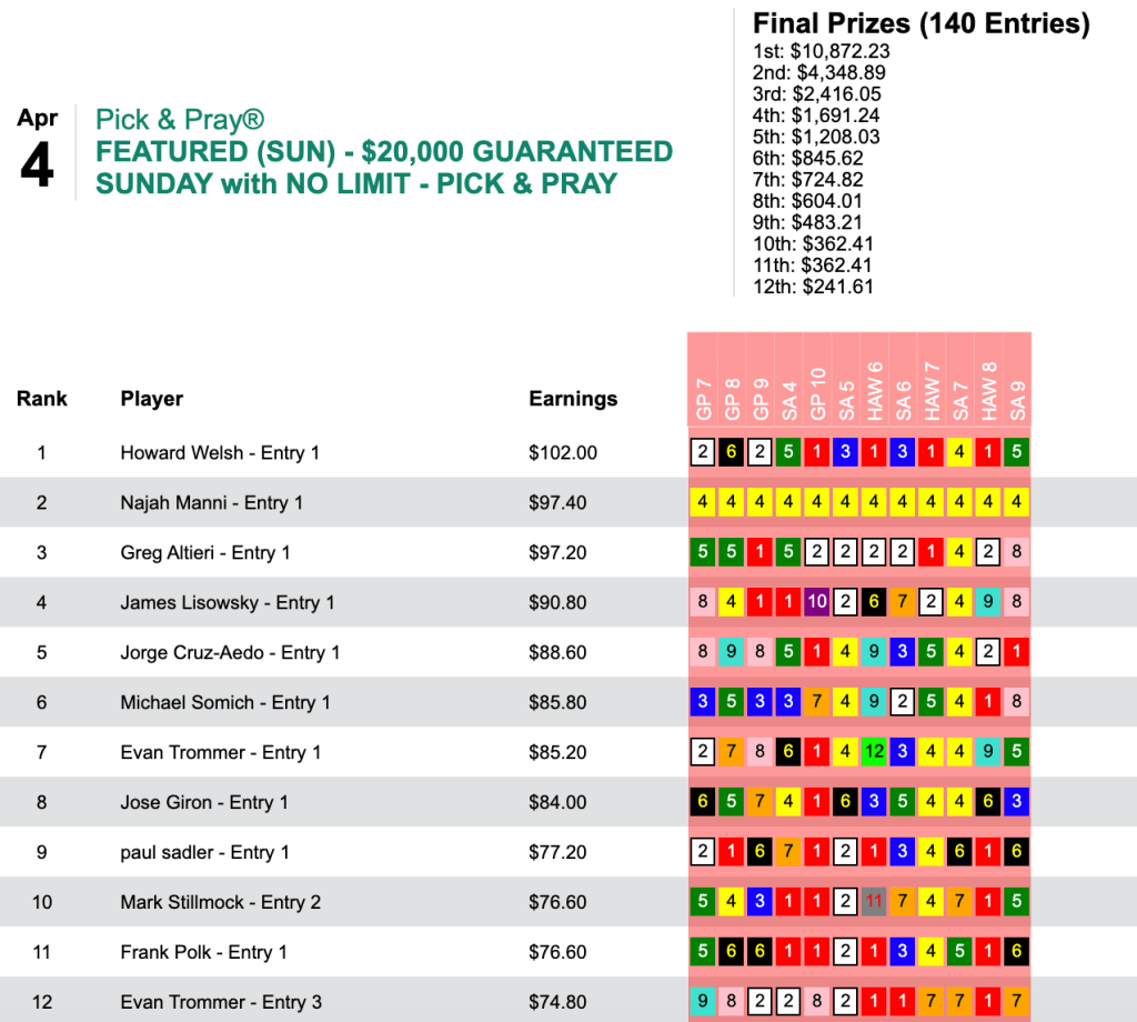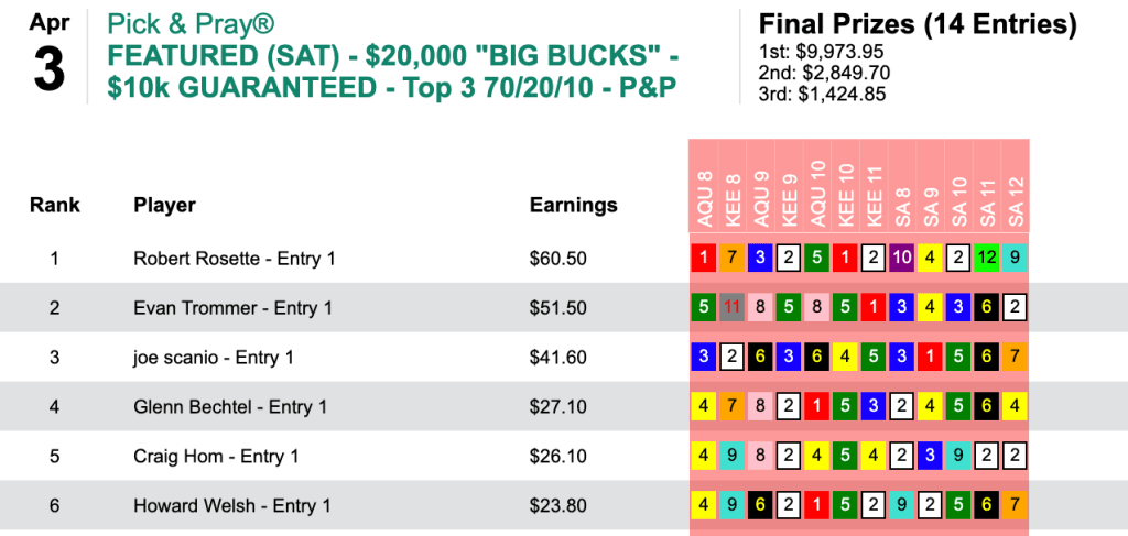 They yielded him $10,872 in Sunday’s $20,000 Guaranteed Pick & Pray (final purse: $24,160)…