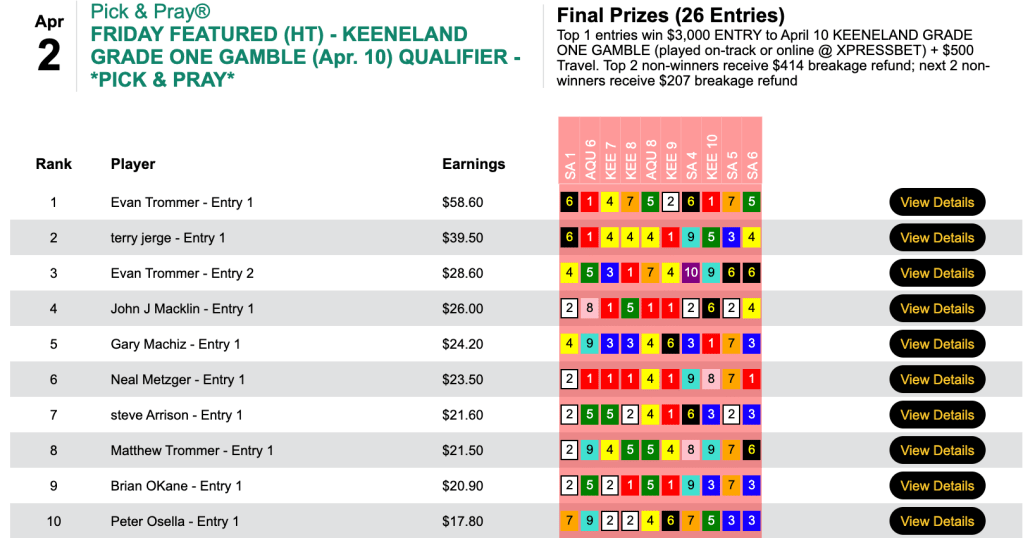 Kevin Englehard (6 wins, 1 place) and Michael Somich (2W, 1P…all in the final 6 contest races) both got the better of Trommer in Sunday’s Keeneland Grade One Gamble qualifier, but all three emerged with $3,500 packages to next Saturday’s competition. For Trommer, we believe this is the 27th Grade One Gamble package he has won this year. (Just kidding…I think.)