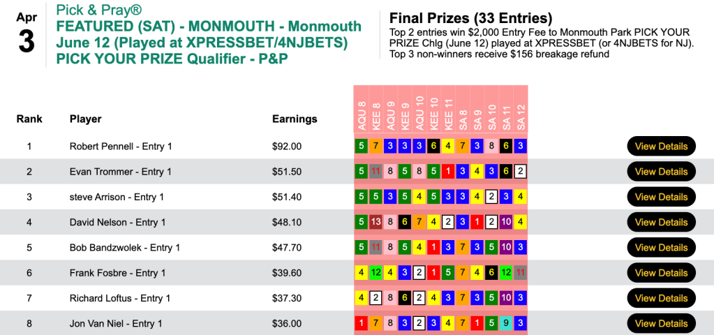On Saturday, the Players Championship here and the Santa Anita Derby Challenge at Xpressbet clearly wasn’t going to provide Trommer with enough action…so tossed his hat into the ring of the Monmouth Pick Your Prize qualifier.