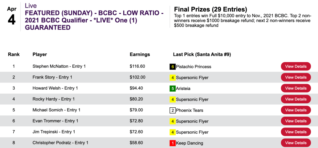 It translated to a victory worth $10,000 (in entry fees) in Sunday’s Breeders’ Cup Betting Challenge Low Ratio qualifier.