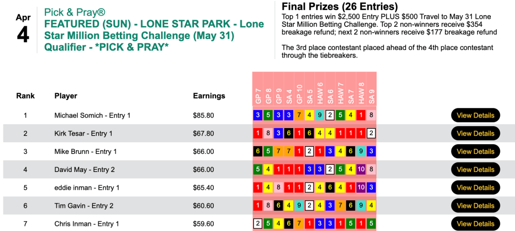 Dallas, to be precise. Grand Prairie, to be preciser. Somich whiffed on the first half of the Sunday contest races, but had two and a place over the last 6 to get the $3,000 package for the Lone Star Million Betting Challenge.
