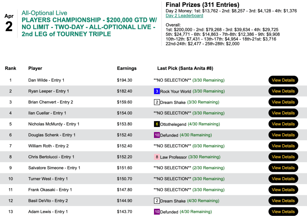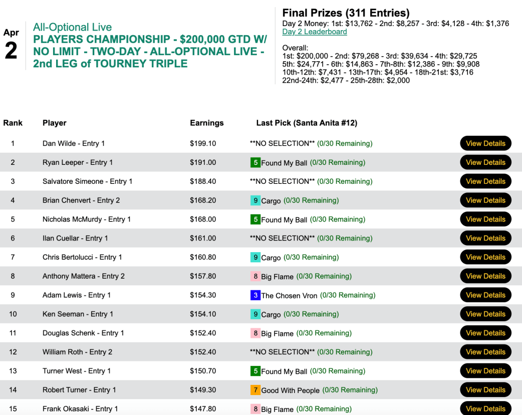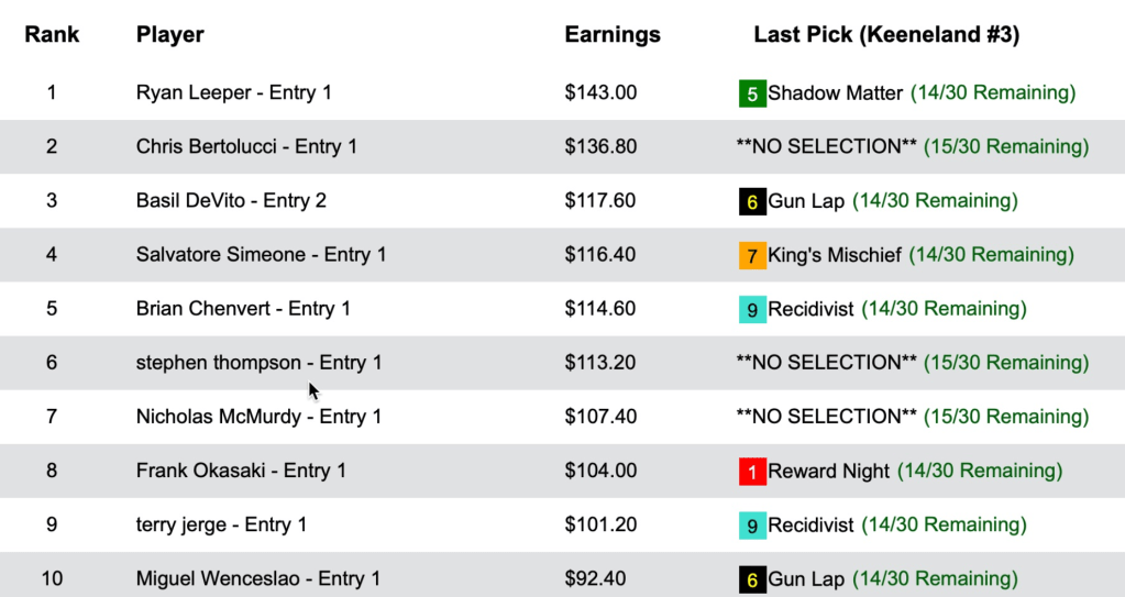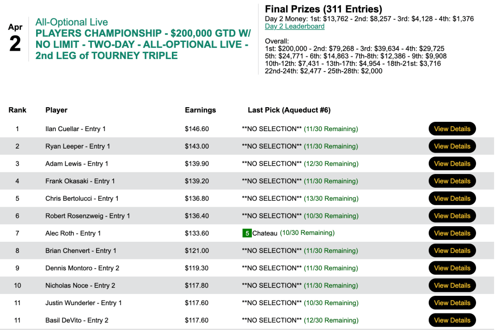 Ryan Leeper, who played a fantastic tournament after having won his seat just 48 hours prior to the Players Championship in a Tampa qualifier, took over the lead early on Day 2 after hitting a 5-2 shot (Shadow Matter) in the 3rd on the Keeneland Blue Grass Stakes Day card.