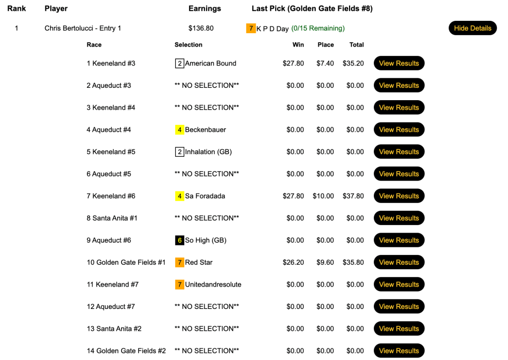 Leeper STILL wasn’t done yet, though. He came back with 5-1 Santa Anita Derby winner Rock Your World to get within $11.90 of Wilde with four contest races remaining.
