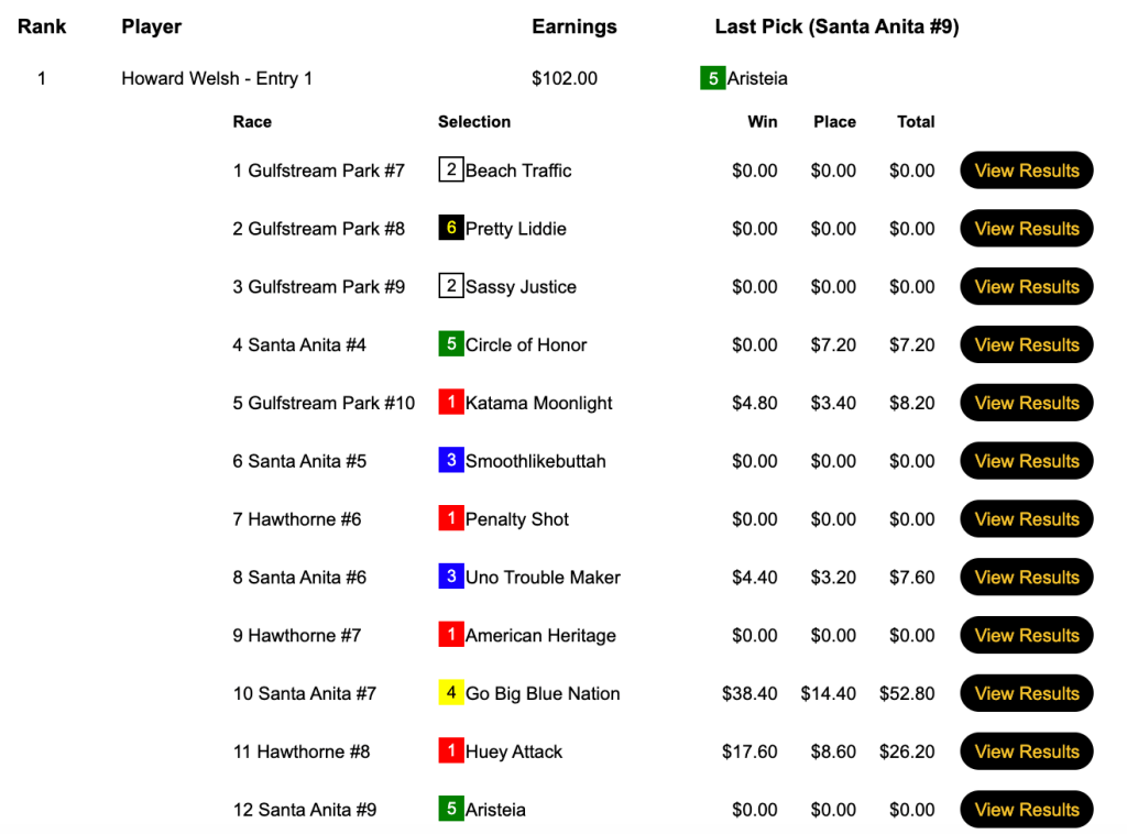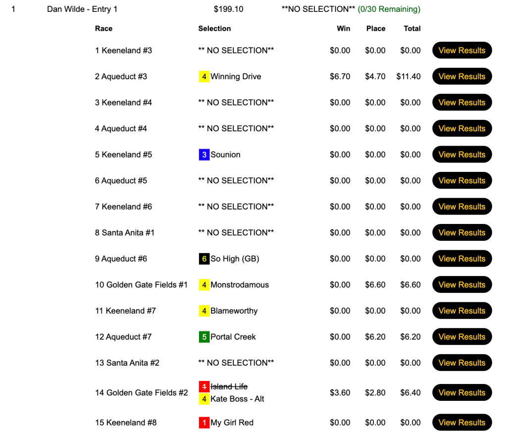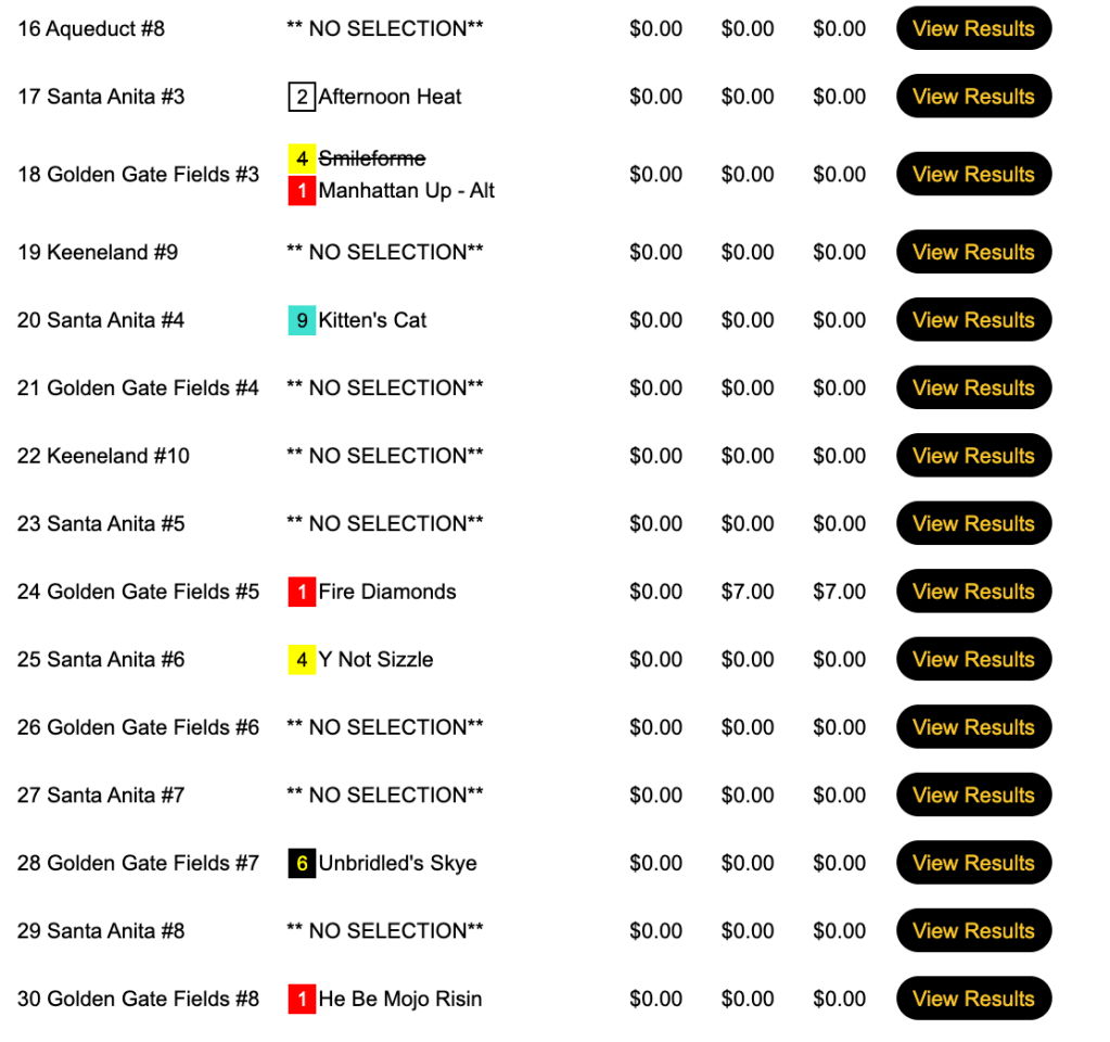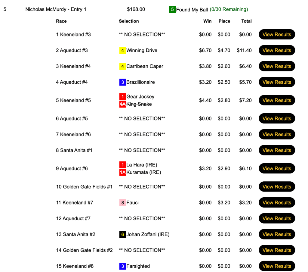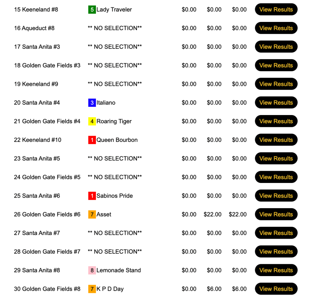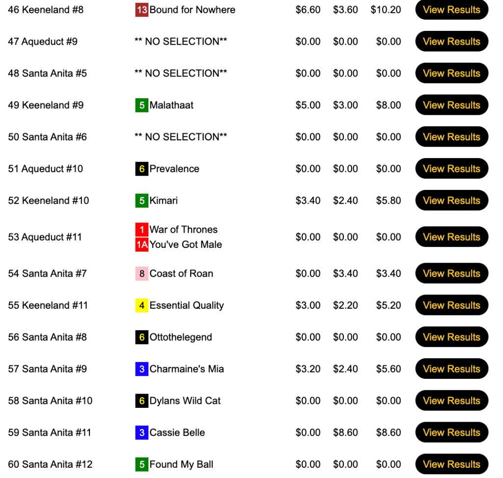 Trommer used the same picks—resulting in 4 winners and 4 runners up—in each. His highest win payoff and highest place payoff were both the same—just $9.00.