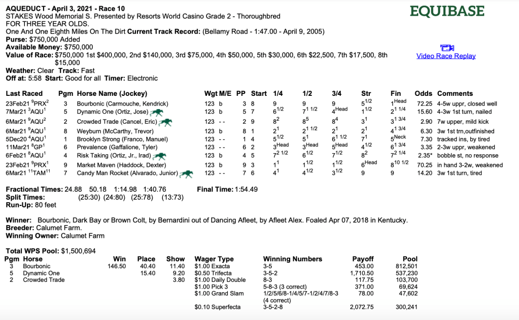 On Saturday morning, Wilde had come to the conclusion that the New York Kentucky Derby prep lacked a standout and that the Todd Pletcher-trained Bourbonic could potentially surprise at a big price. He entered the pick right then and there and never changed it. Good (non) move.