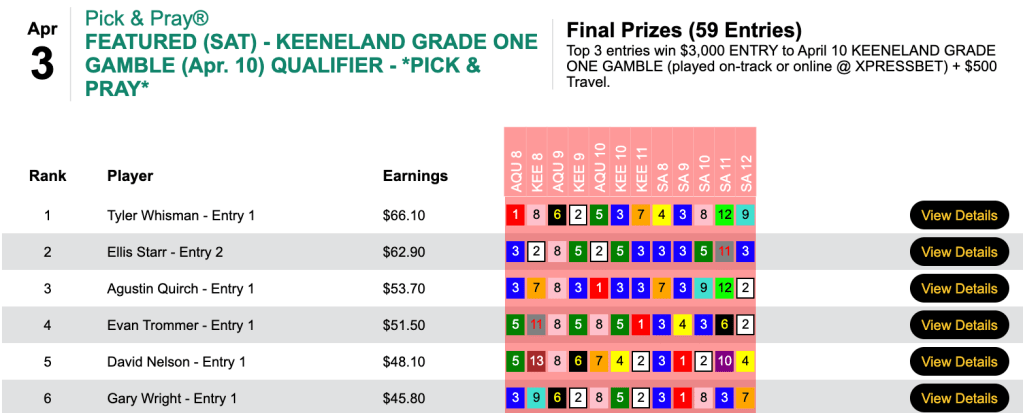Tyler Whisman (3 places followed by 2 wins), Ellis “Ubercapper” Starr (7W, 2P) and Agustin Quirch (3W, 2P) were the three grand-prize recipients in Saturday’s Keeneland Grade One Gamble qualifier.