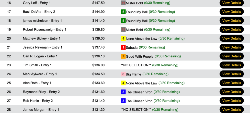 Thirty selections, 16 winners (including a 9-1 shot) and five places. Despite flattening out a bit at the end when he seemingly expanded his scope of playable horses, McMurdy was like a deadly accurate sniper throughout much of the two days. They say a short price beats a long face. In this case, $24,771 beats…all but Wilde, Leeper, Simeone and Chenvert.