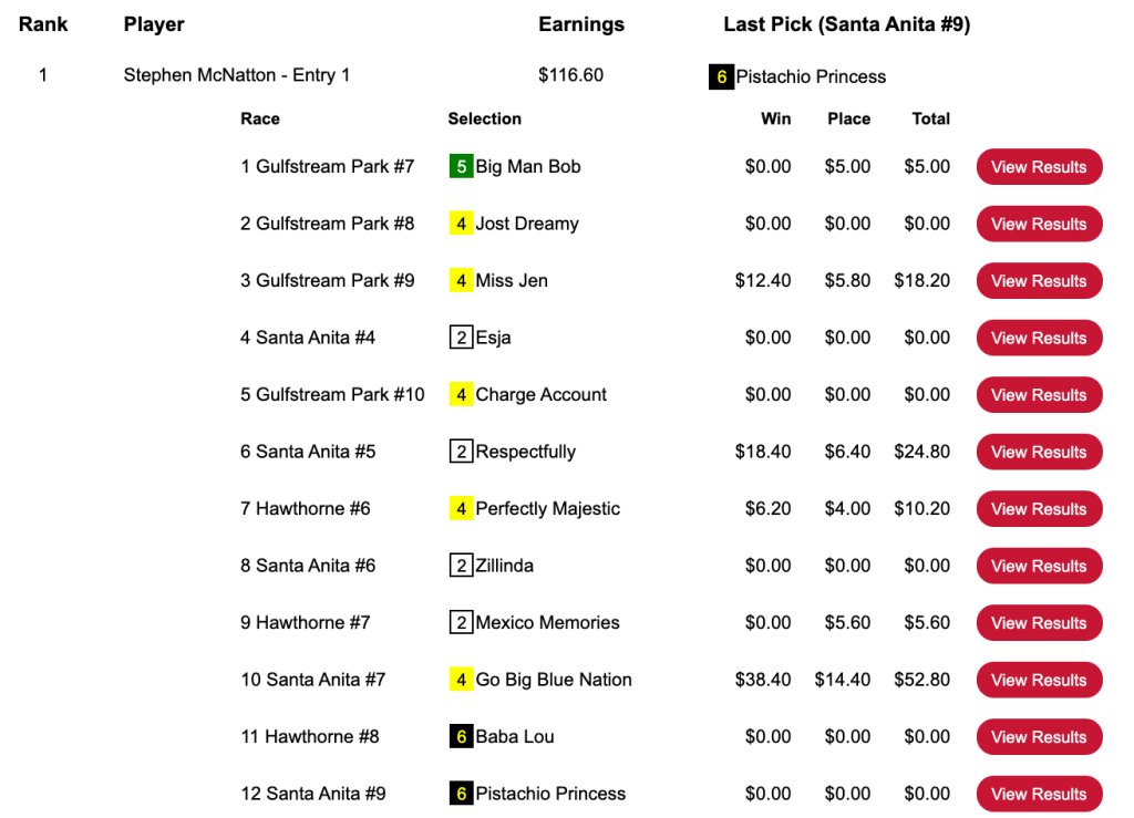Trommer had 5 wins and a place. Key to his narrow victory were three innocuous looking winners that paid $2.60, $4.40 and $4.60—but obviously those small collections made the difference. Without any one of them, Trommer loses.