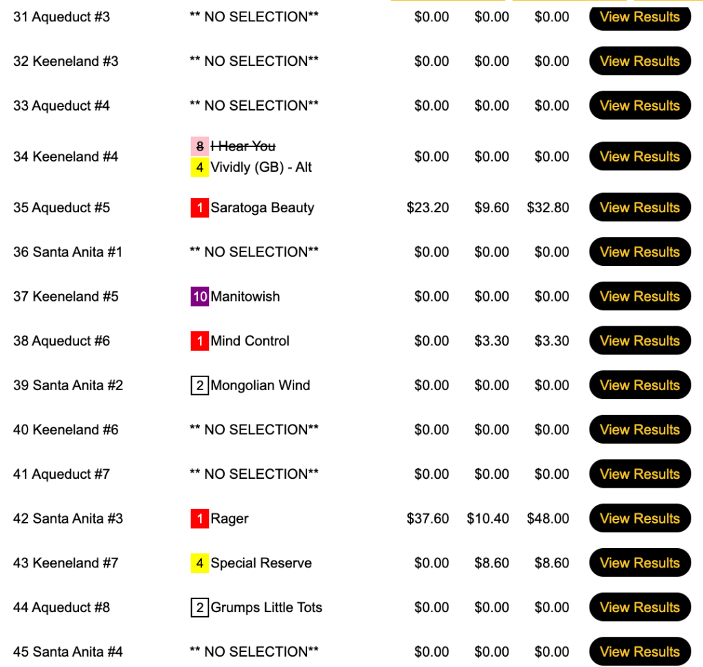 The Texan had come up with Saratoga Beauty ($23.20, $9.60) in race 5 at Aqueduct and Rager ($37.60, 10.40) in the 3rd at Santa Anita to vault himself all the way up to 12th in the standings.
