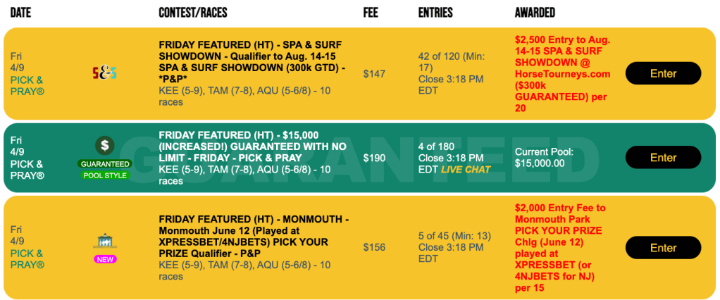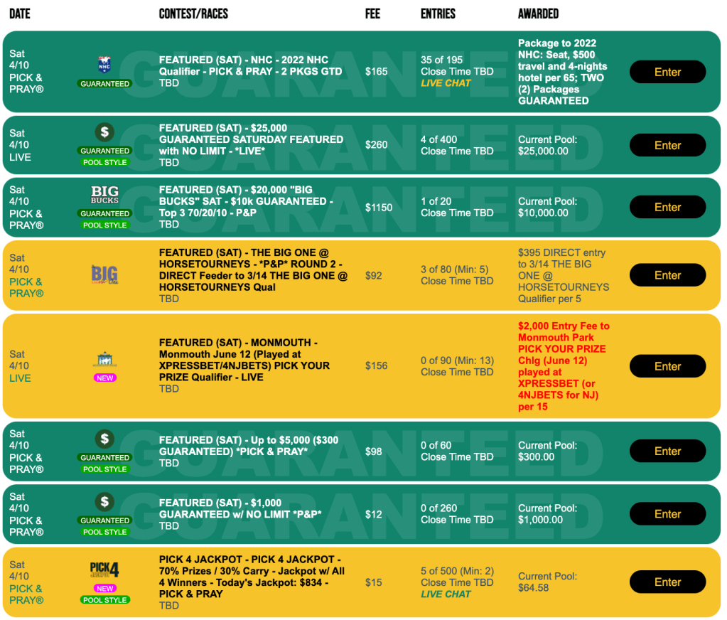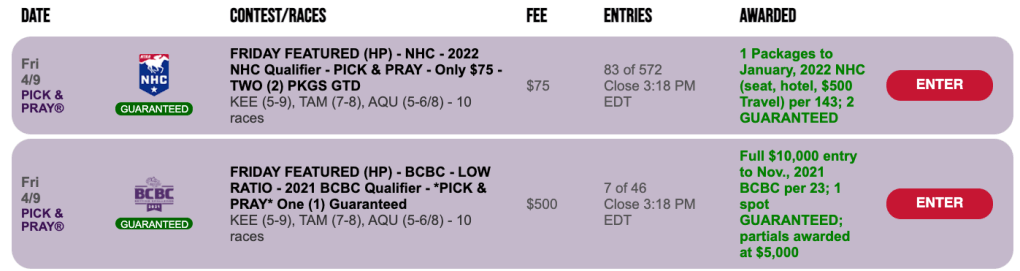 There’s an NHC qualifier here at HorseTourneys on Saturday. It’s a “regular,” $165 Pick & Pray with two berths to the 2022 event assured.