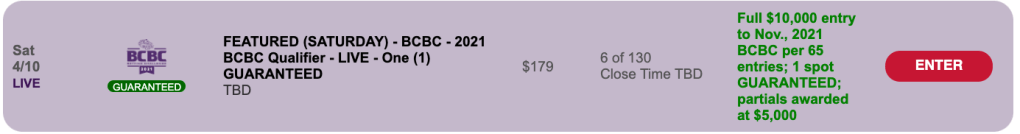 It’s a $179, live-format qualifier with at least one $10,000 entry certain to be awarded. The winning ratio is 1-per-65.