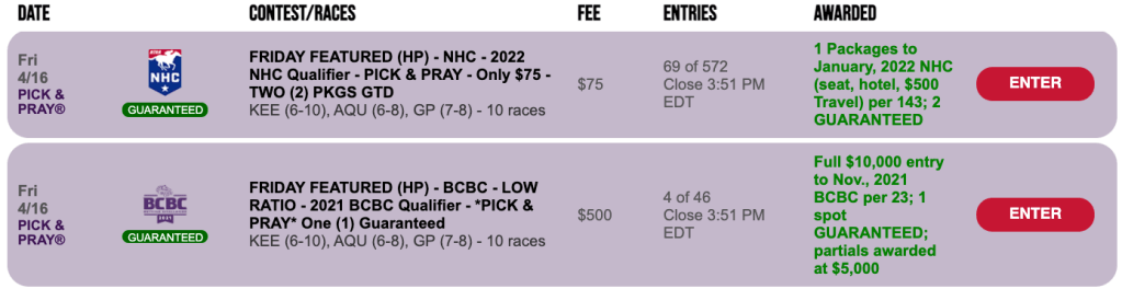 Entries cost $3,000 each for this event in which you can compete for NHC seats, Pegasus World Cup entries and plenty of bonus cash. However, on Friday and Sunday, you can secure a spot in the Derby Day Challenge for $177 in our first two qualifiers to this First Saturday in May competition.